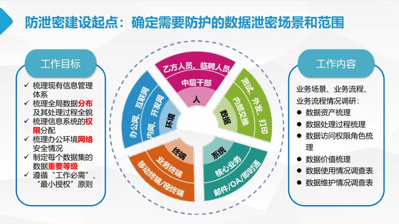 数据防泄密需从行业态势研判、核心思路确立、场景化方案落地、管理体系搭建、技术能力支撑五方面系统性推进,兼顾安全与业务效率,实现全流程、多维度防控,核心做法如下: