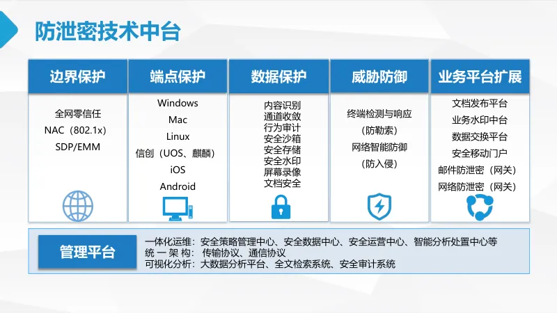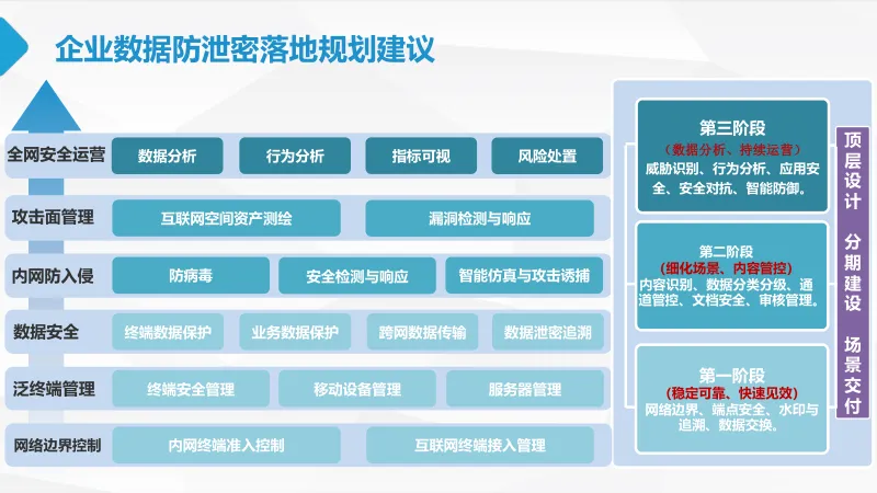 - 五、分期建设落地,强化持续运营按 “快速见效 — 细化管控 — 智能防御” 分三阶段建设,先筑牢网络边界、端点安全,再推进数据分类分级与内容管控,最后实现行为分析与智能防御;同时开展全员安全培训,通过水印震慑、审计追责提升员工安全意识,防范无意泄密与主动窃密。