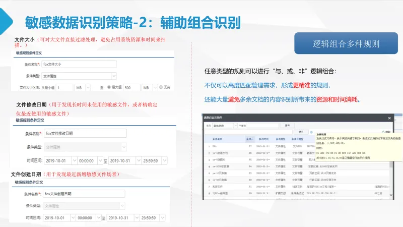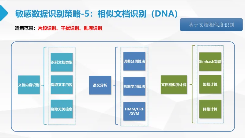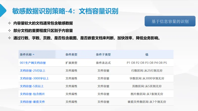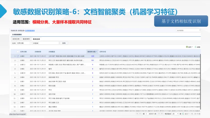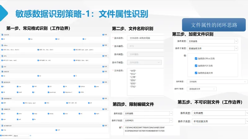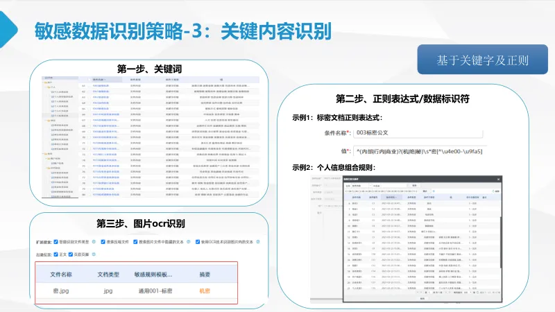 - 四、精准识别敏感数据,筑牢防控基础通过文件属性、关键字 / 正则、图片 OCR、文档 DNA、智能聚类等 6 大策略,结合人工定级与技术扫描,完成敏感数据分类分级,建立特征规则库,实现敏感数据的自动识别、扫描与预警。