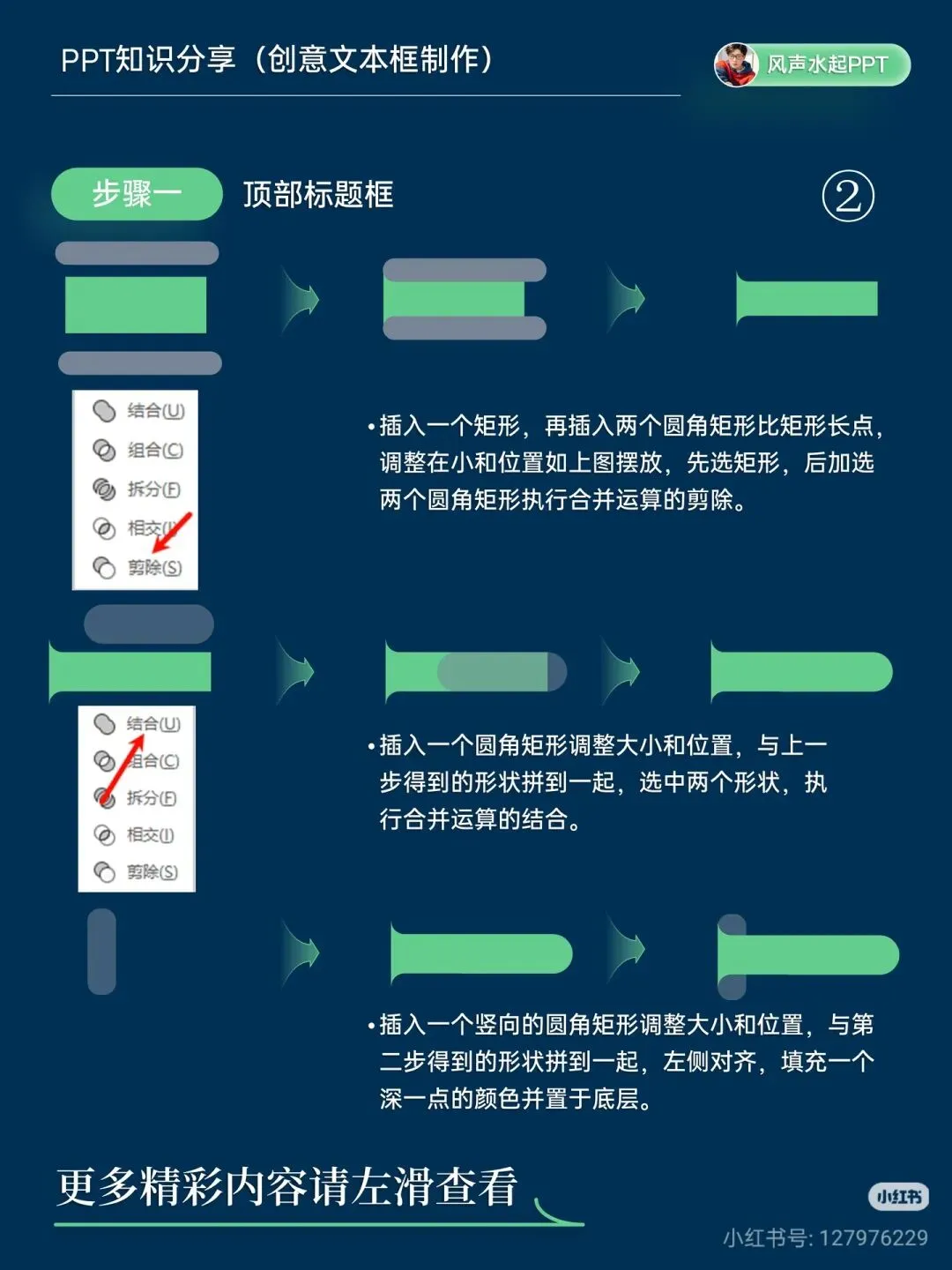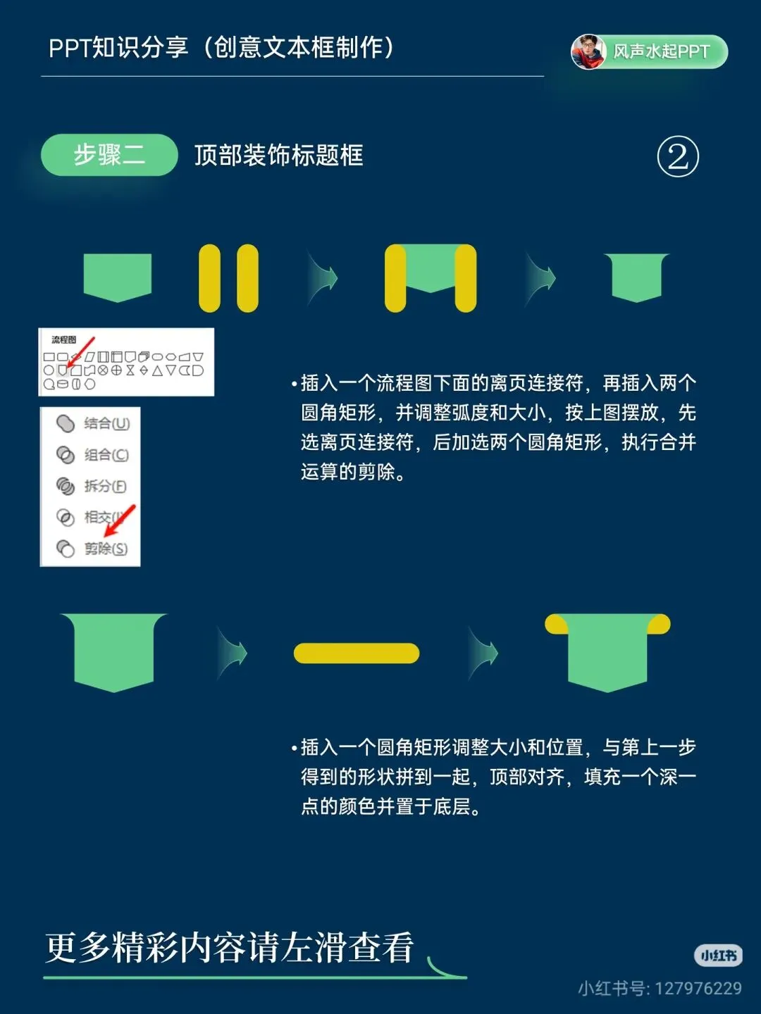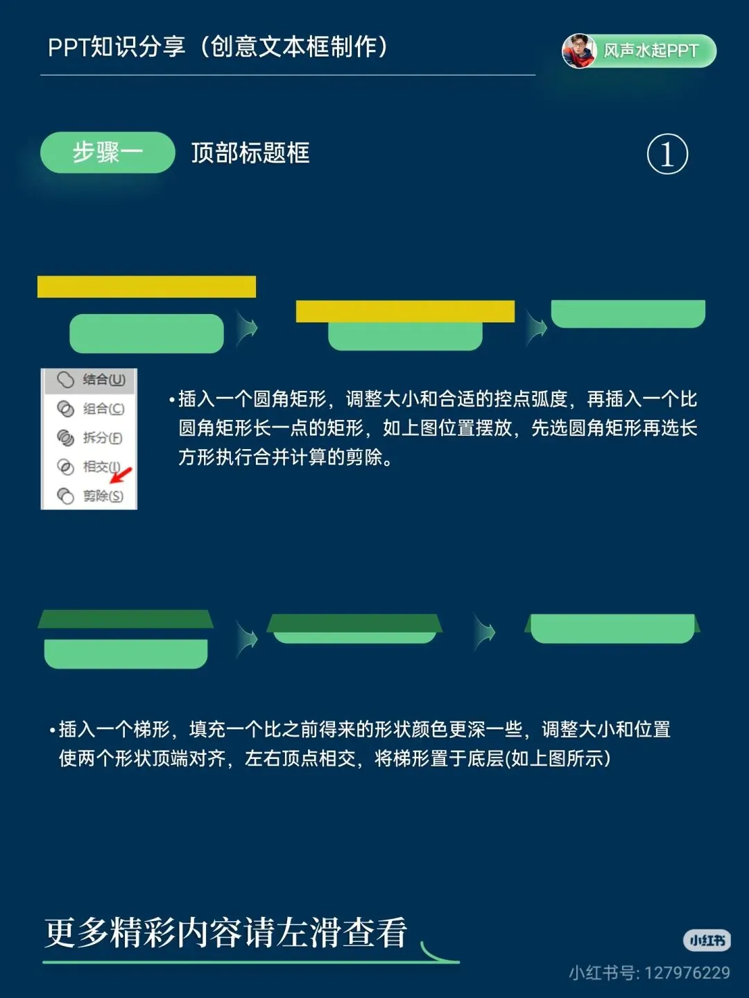 🔹 方法一:层次叠压式文本卡 步骤 1:制作顶部标题框 插入圆角矩形,调整弧度;再插入一个稍长的矩形,按图示摆放。 先选圆角矩形,再选长矩形,执行「合并计算→剪除」。