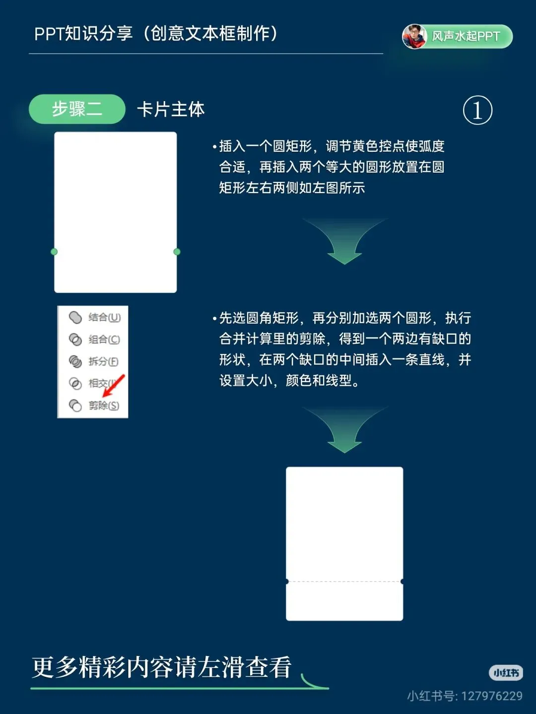 步骤 2:制作卡片主体 插入圆角矩形,调节弧度;再插入两个等大圆形,放在圆角矩形两侧。 先选圆角矩形,再加选两个圆形,执行「合并计算→剪除」,得到两侧缺口的形状。