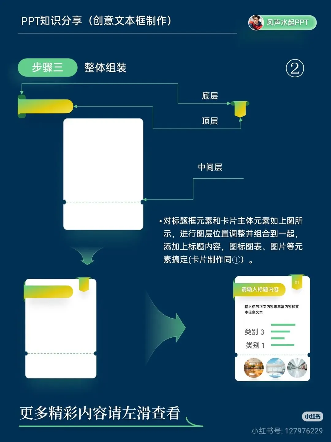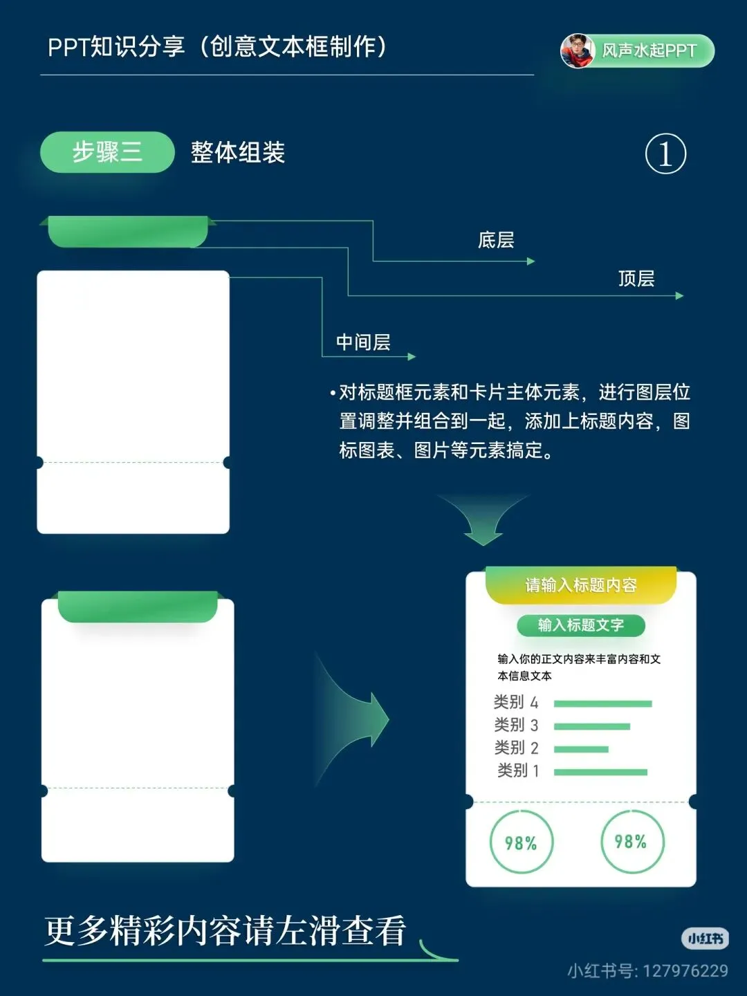 步骤 3:整体组装 将标题框、卡片主体调整图层顺序,添加标题、正文、图表、图标等元素,一个层次丰富的文本卡就完成啦!