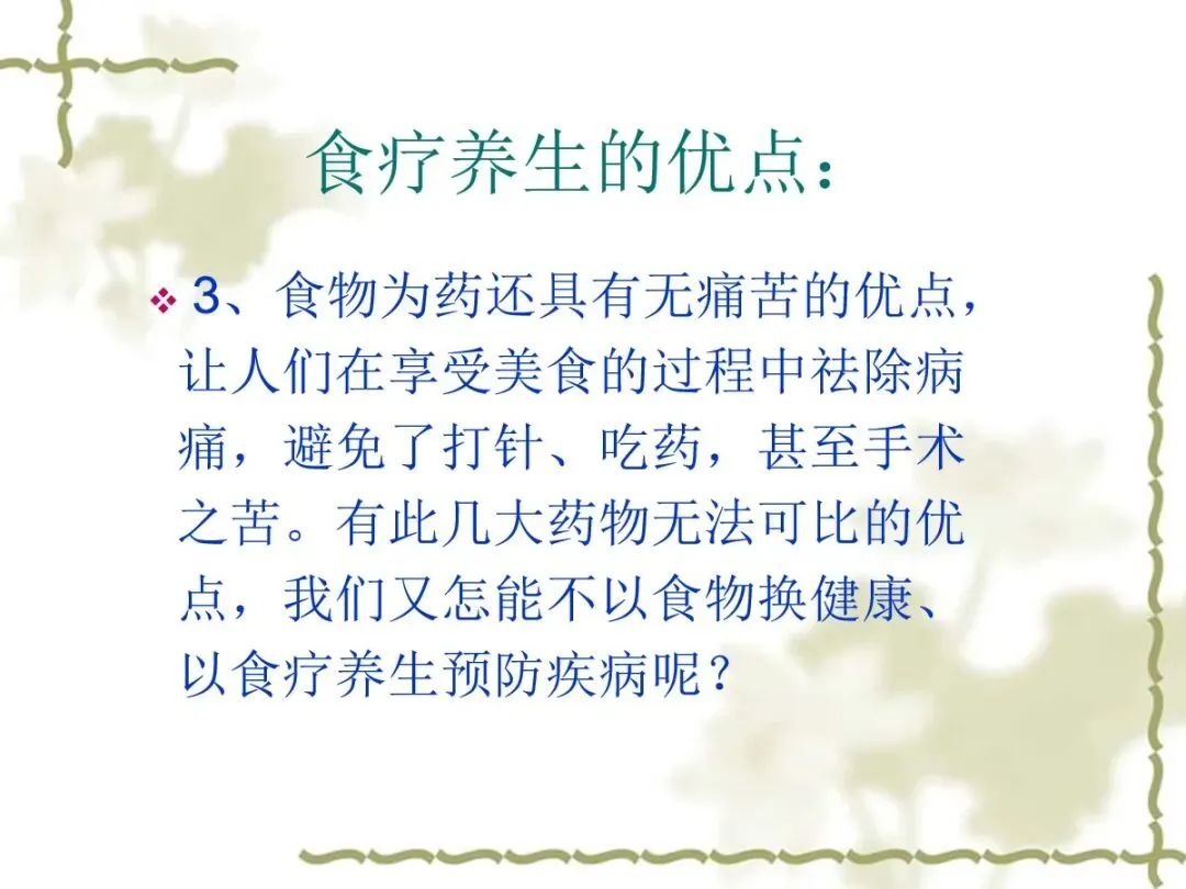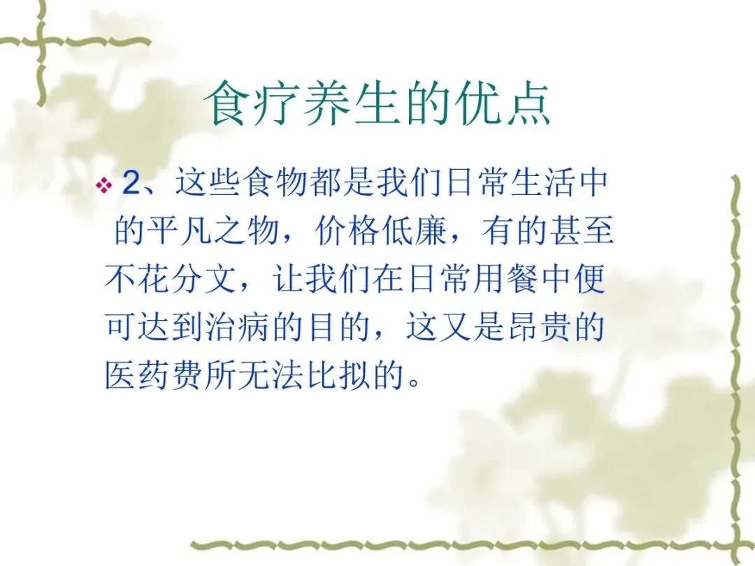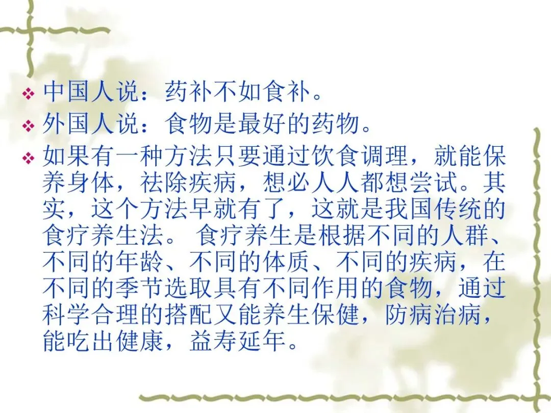 起初饮食为了温饱,经过长期的实践后,中国古代养生家、医学家们实践总结发现人们只要能根据自身的需要,选择适宜的食物进行调养,就能保养身体,甚至治病,可以起到益寿延年的作用。唐代《千金要方》中记载:“安生之本,必资于食。不知食宜者,不足以存生也。”食物和药物一样能辨证是中医学精髓,当然现代人食疗养生能遵循这一原则会事半功倍。