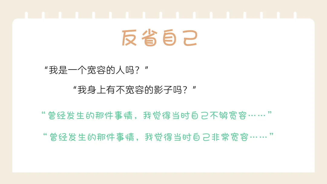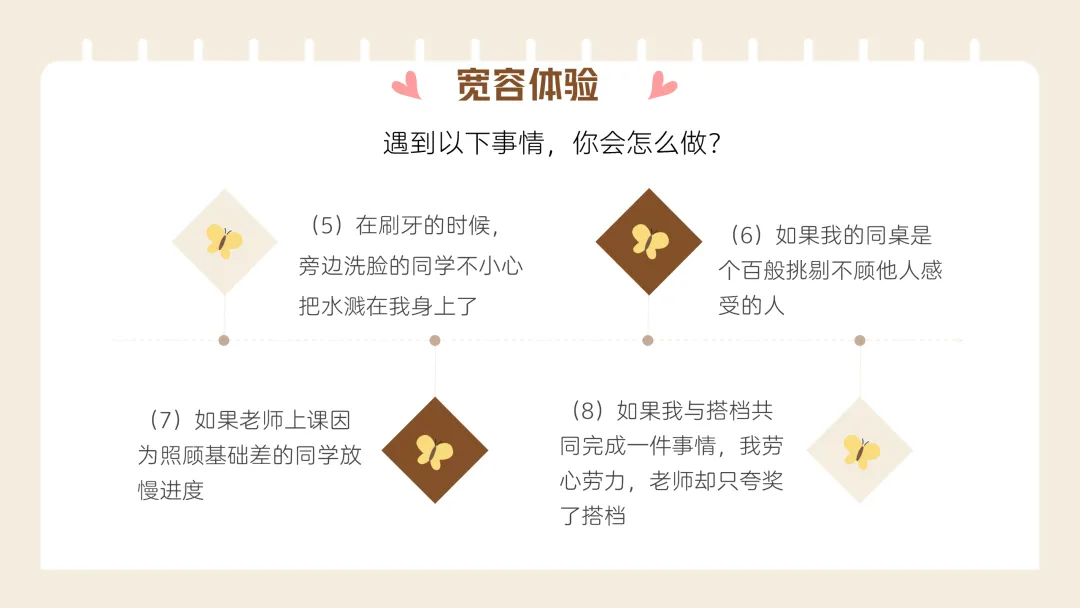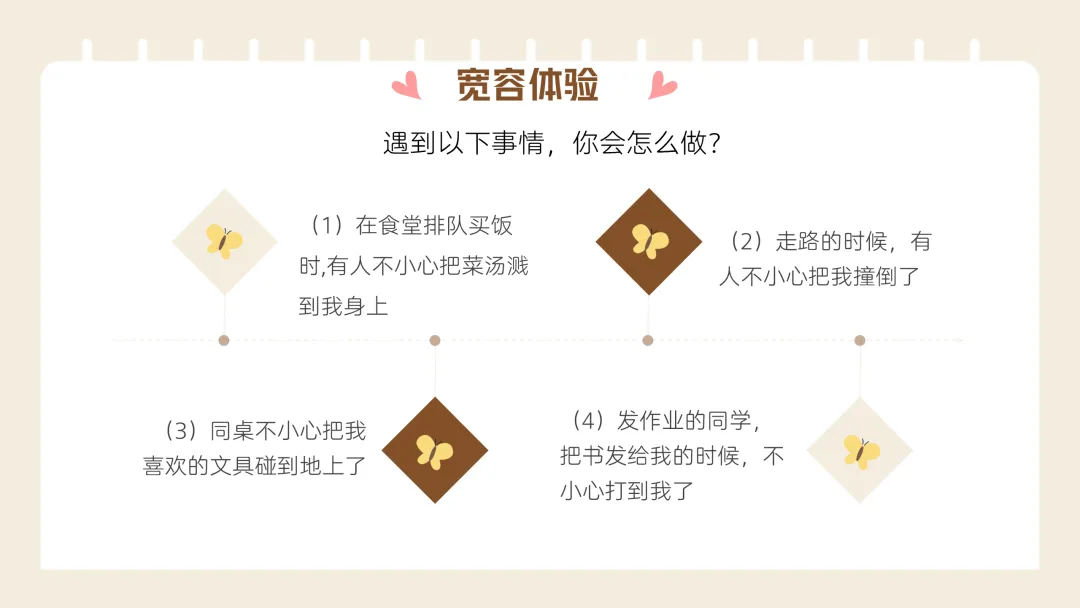 最后结合校园生活场景设计宽容体验题,教学生学会实际生活中如何做到宽容,同时明确宽容的边界,让教育更有深度。