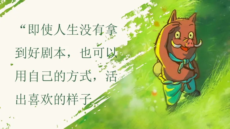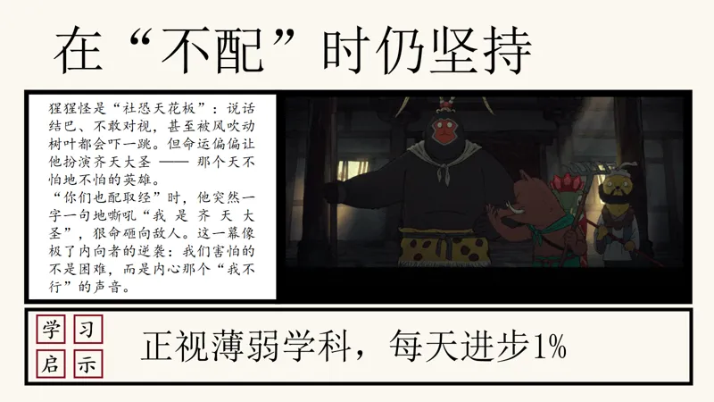 在“不配”时仍坚持,这是猩猩怪给我们的启示。他是一个社恐患者,说话结巴,不敢对视,甚至被风吹动树叶都会吓一跳。但命运偏偏让他扮演齐天大圣——那个天不怕地不怕的英雄。在关键时刻,他一字一句地嘶吼出“我是齐天大圣”,那一刻,他仿佛真的成为了那个英雄。同学们,当你们面对自己的薄弱环节时,是否也能像猩猩怪一样,勇敢地坚持下去呢?