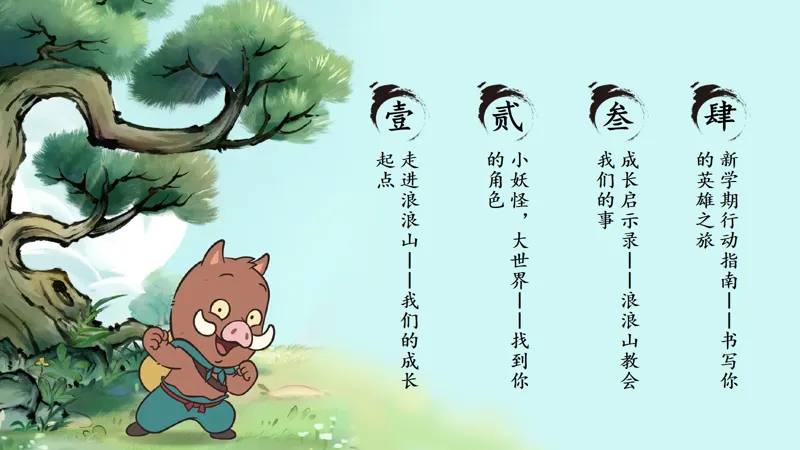 第 3 页本次课程,我们将分为四个部分来探索“浪浪山”的奥秘:走进浪浪山——我们的成长起点;小妖怪,大世界——找到你的角色;成长启示录——浪浪山教会我们的事;以及新学期行动指南——书写你的英雄之旅。每一部分,都将是你们心灵成长的宝贵财富。