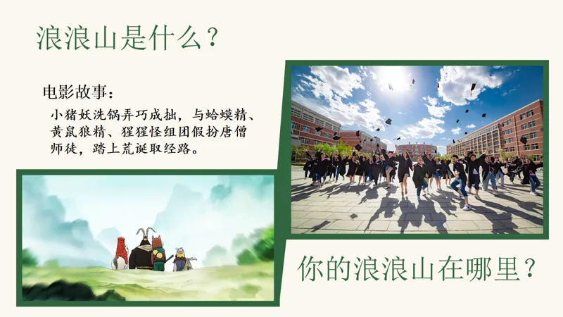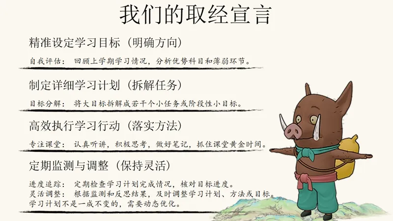 电影中的小猪妖,因为洗锅弄巧成拙,意外地与蛤蟆精、黄鼠狼精、猩猩怪组成了一支荒诞的队伍,踏上了假扮唐僧师徒的取经路。这不仅仅是一场闹剧,更是他们成长的开始。同学们,你们的“浪浪山”在哪里呢?是面对新学科的迷茫,还是与新老师、新同学的相处之道?让我们从电影中汲取灵感,勇敢地迈出第一步。