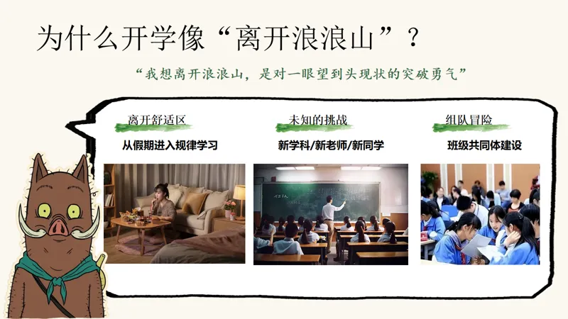 为什么开学会让我们感到像是“离开浪浪山”?因为,从假期的轻松惬意,到新学期的规律学习,从熟悉的环境到全新的挑战,这一切都让我们感到不安。新学科、新老师、新同学,还有班级共同体的建设,都是我们必须面对的未知。但请记住,每一次离开舒适区,都是一次成长的机会。组队冒险,让我们携手并肩,共同面对这些挑战。