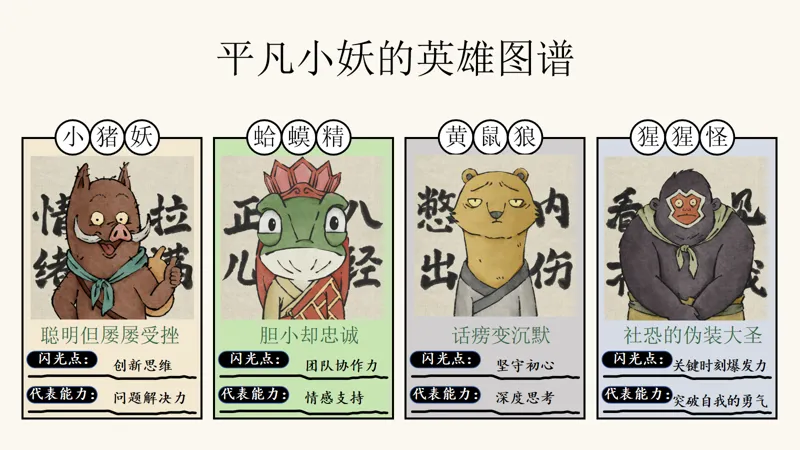 小妖怪,大世界。在这个广阔的世界里,每个人都有自己的角色。小猪妖,虽然聪明却屡屡受挫;蛤蟆精,胆小却忠诚;黄鼠狼,话痨变沉默;猩猩怪,社恐却能在关键时刻爆发。他们用自己的方式,诠释了什么是勇气,什么是坚持。同学们,你们可能是哪种小妖怪呢?记住,没有完美的英雄,每个人都是“未完成品”,但正是这些不完美,构成了我们独一无二的个性。