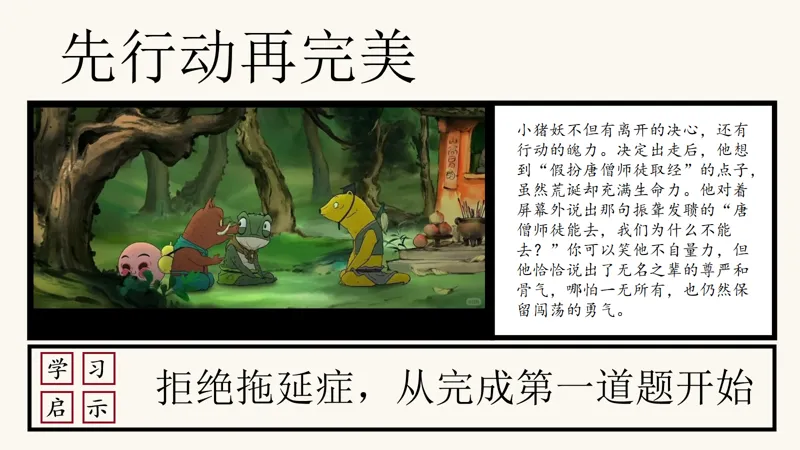 先行动再完美,这不仅仅是一句口号,更是一种生活态度。小猪妖决定出走后,他没有犹豫,没有等待,而是立刻想到了“假扮唐僧师徒取经”的点子。虽然这个点子荒诞不经,但却充满了生命力。他用自己的行动,诠释了什么是勇气,什么是决心。同学们,当你们面对挑战时,是否也能像小猪妖一样,勇敢地迈出第一步呢?