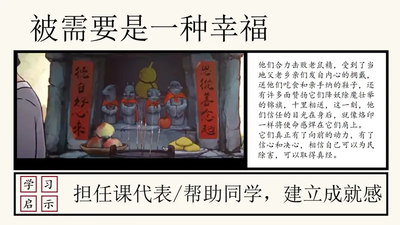 被需要是一种幸福,这是四小妖合力击败老鼠精后得到的启示。他们受到了当地父老乡亲们的拥戴,那一刻,他们真正感受到了自己的价值。同学们,当你们在班级中担任课代表,或者帮助同学解决问题时,是否也能感受到这种幸福呢?记住,被需要是一种动力,它让我们更加自信,更加坚定地走向未来。