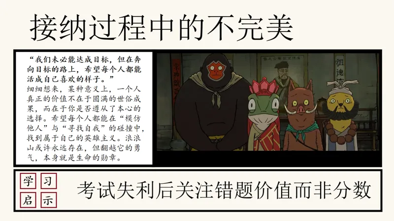 接纳过程中的不完美,这是浪浪山给我们的另一个重要启示。我们未必能达成所有的目标,但在奔向目标的路上,我们活成了自己喜欢的样子。考试失利后,关注错题的价值而非分数;在模仿他人与寻找自我的碰撞中,找到属于自己的英雄主义。同学们,当你们面对失败时,是否也能像这样,坦然接受,然后从中汲取力量呢?