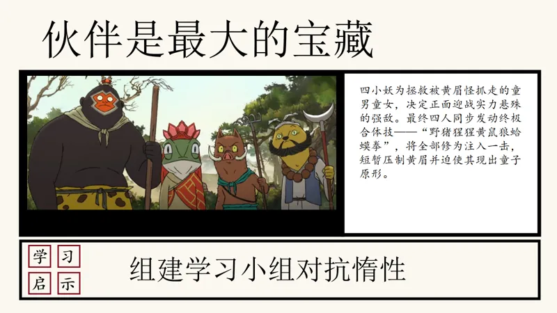 伙伴是最大的宝藏,这是四小妖为拯救童男童女,正面迎战黄眉怪时得到的启示。他们四人同步发动终极合体技,将全部修为注入一击,短暂压制了强敌。那一刻,他们明白了,伙伴的力量是无穷的。同学们,当你们在学习上遇到惰性时,不妨组建一个学习小组,与伙伴们一起对抗惰性,共同进步。