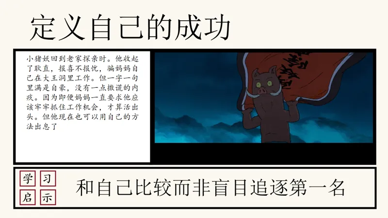 定义自己的成功,这是小猪妖回到老家探亲时给我们的启示。他没有按照妈妈的要求,牢牢抓住工作机会,而是用自己的方式活出了出息。他用自己的行动告诉我们,成功不是别人定义的,而是自己定义的。同学们,当你们在学习上追求成功时,是否也能像小猪妖一样,与自己比较,而非盲目追逐第一名呢?