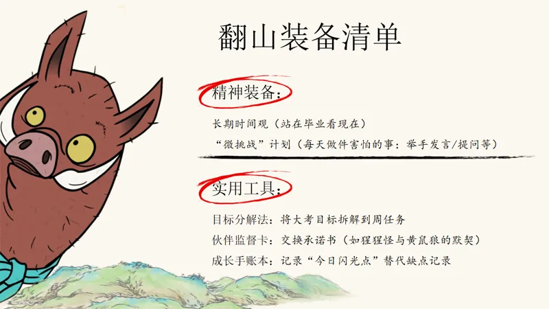 精神装备,是我们踏上英雄之旅的必备品。长期时间观,让我们站在毕业的角度看现在,更加珍惜每一分每一秒;“微挑战”计划,让我们每天做一件害怕的事,逐渐克服内心的恐惧。这些精神装备,将帮助我们更加坚定地走向未来。