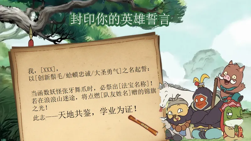 现在,让我们一起来封印你的英雄誓言吧!我,[XXX],以[创新鬃毛/蛤蟆忠诚/大圣勇气]之名起誓:当函数妖怪张牙舞爪时,必祭出[法宝名称]!若在浪浪山迷途,将点燃[队友姓名]赠的锦旗之光!此志——天地共鉴,学业为证!让我们用这份誓言,激励自己在新学期里勇往直前,不断超越自我!