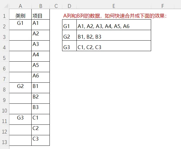 题目:请将A列和B列的数据,合并成右边所示的效果。该如何写公式呢?