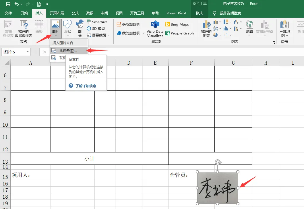 打开需要插入签名的Excel表格,定位到目标位置。点击“插入”选项卡,在菜单中选择“图片”,再点击“此设备”。此时,会弹出文件选择窗口,浏览并找到你刚上传的签名图片,点击“插入”。