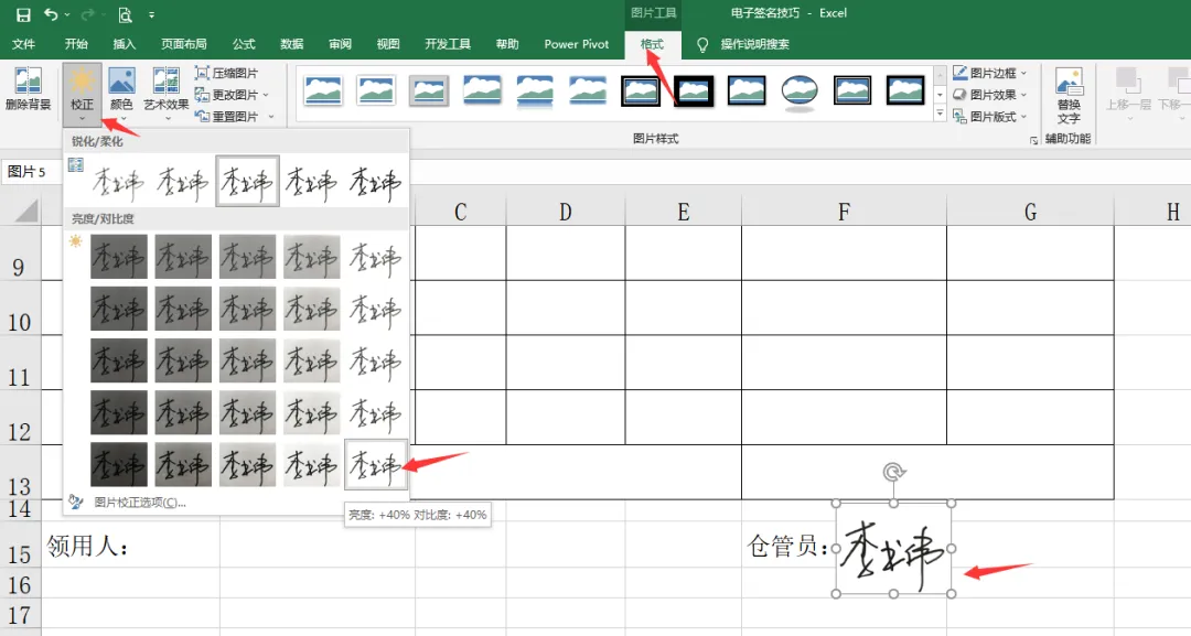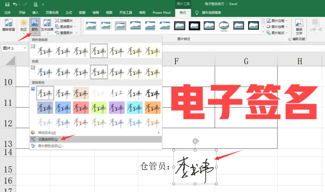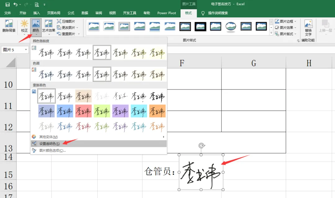 为了让签名更加自然地融入表格,需将图片背景设为透明。点击“格式”选项卡,↓