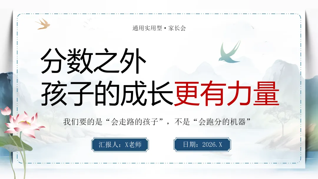 很高兴在这与您相遇,如果您是一位班主任老师,每天除了应对繁重的教学工作,还要加班整理班级、教务、教研、课件PPT资料,请关注下方的“春雨教务资料”,让我们风雨同路、一起成长~今天分享的是初高中通用家长会的ppt课件和配套的发言稿,主题是《分数之外,孩子的成长更有力》分数之外,孩子的成长更有力量