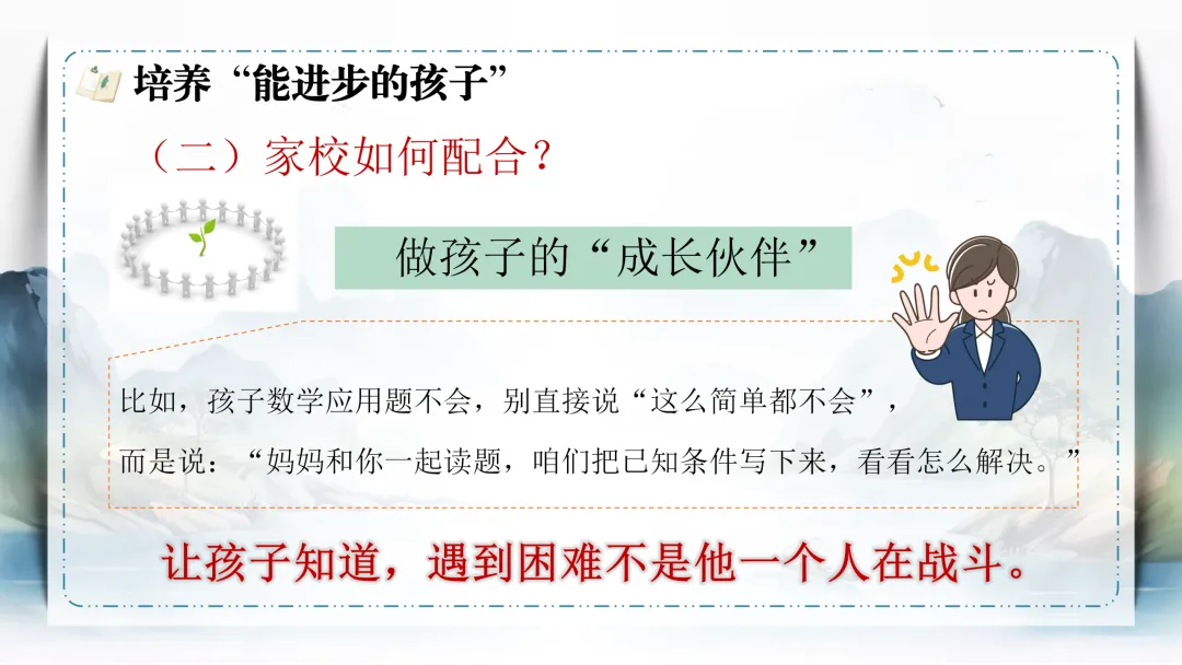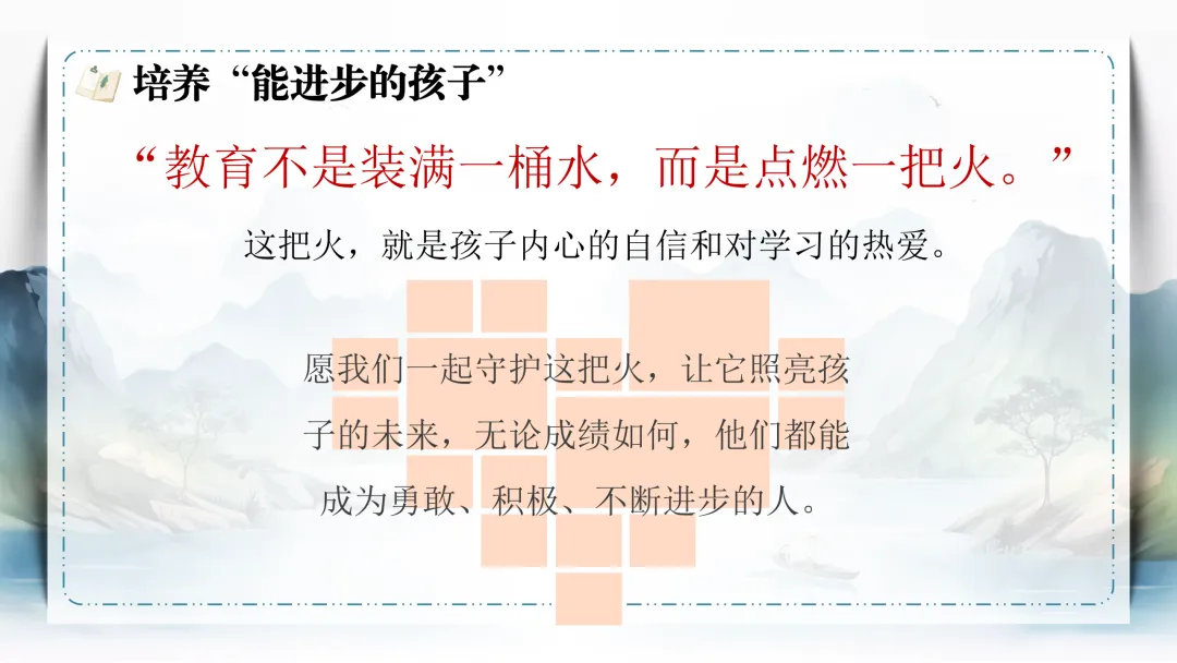 本次家长会的主要内容分4部分进行:01 成绩是学习的“温度计”;02 保护孩子的“自信种子”;03 成绩好 or 不好;04 培养“能进步的孩子”。