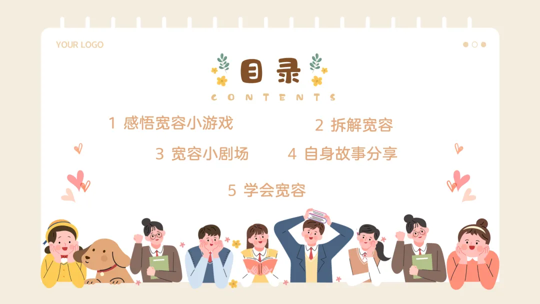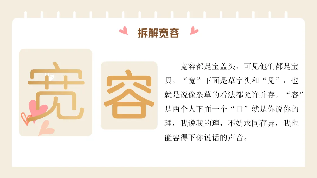 宽容都是宝盖头,可见他们都是宝贝。“宽”下面是草字头和“见”,也就是说像杂草的看法都允许并存。“容”是两个人下面一个“口”就是你说你的理,我说我的理,划的屋子需要占邻居的3尺地。