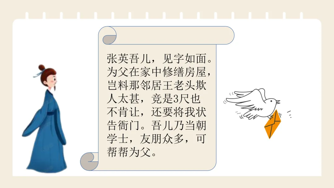 张英老爹回到家中就修书一封:张英吾儿,见字如面。为父在家中修缮房屋,岂料那邻居王老头欺人太甚,竞是3尺也不肯让,还要将我状告衙门。吾儿乃当朝学士,友朋众多,可帮帮为父。