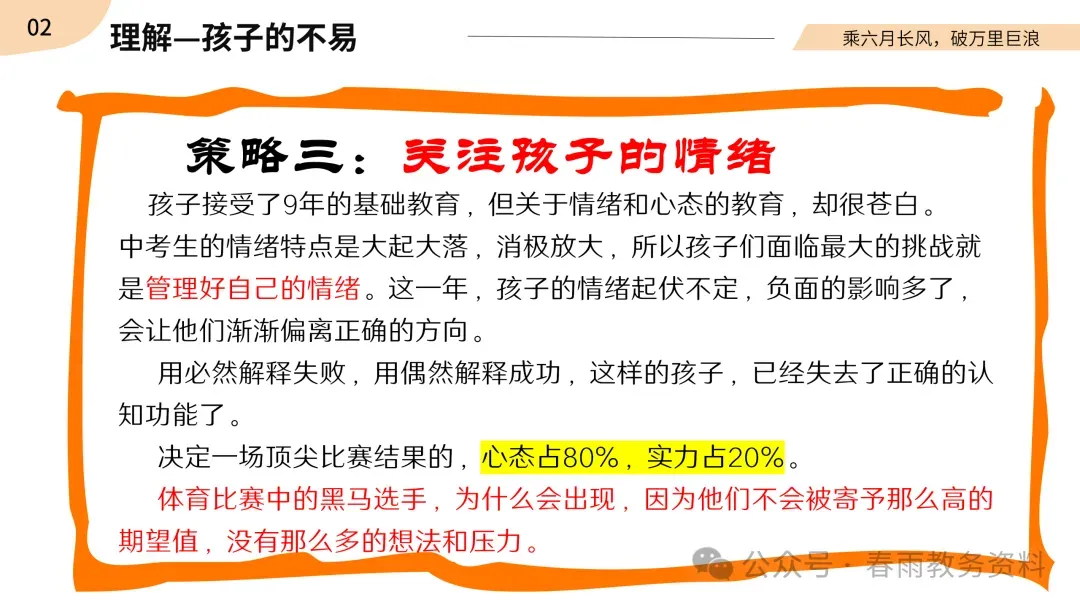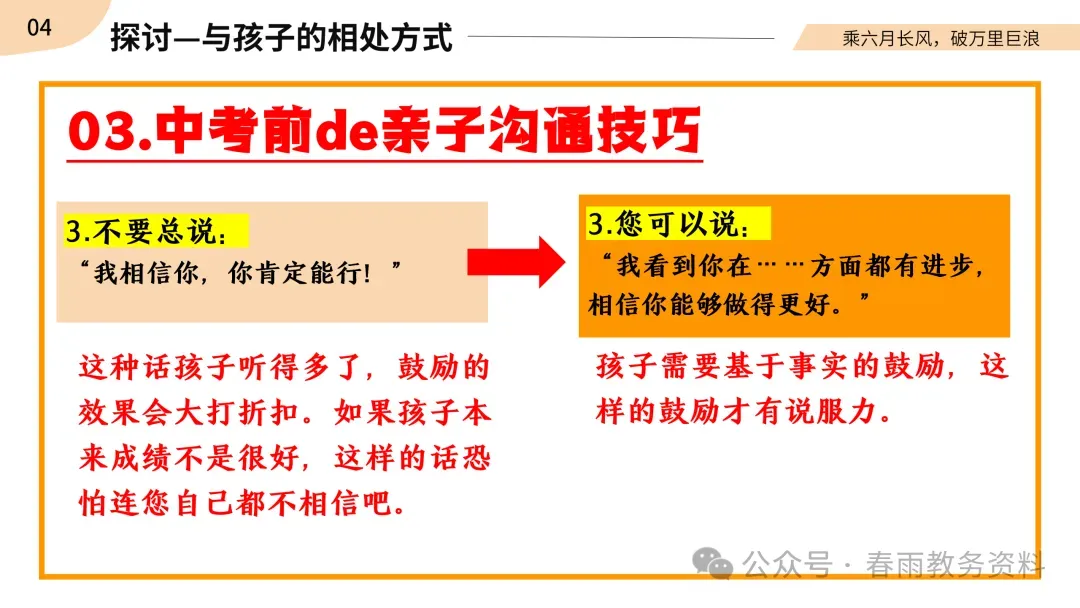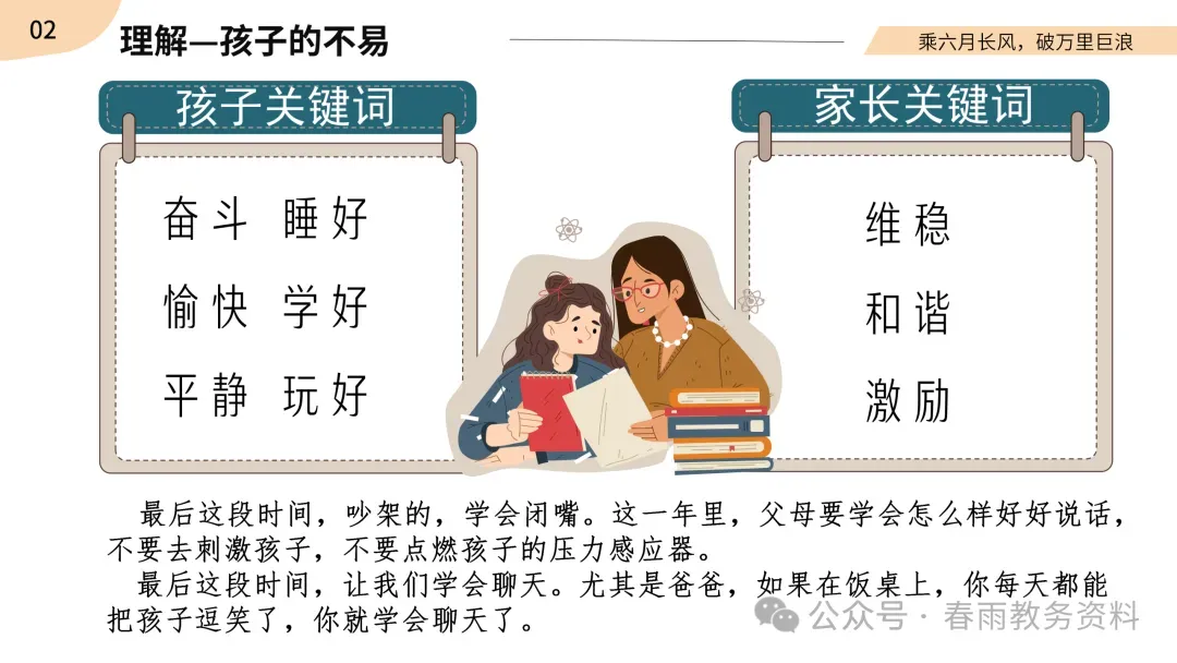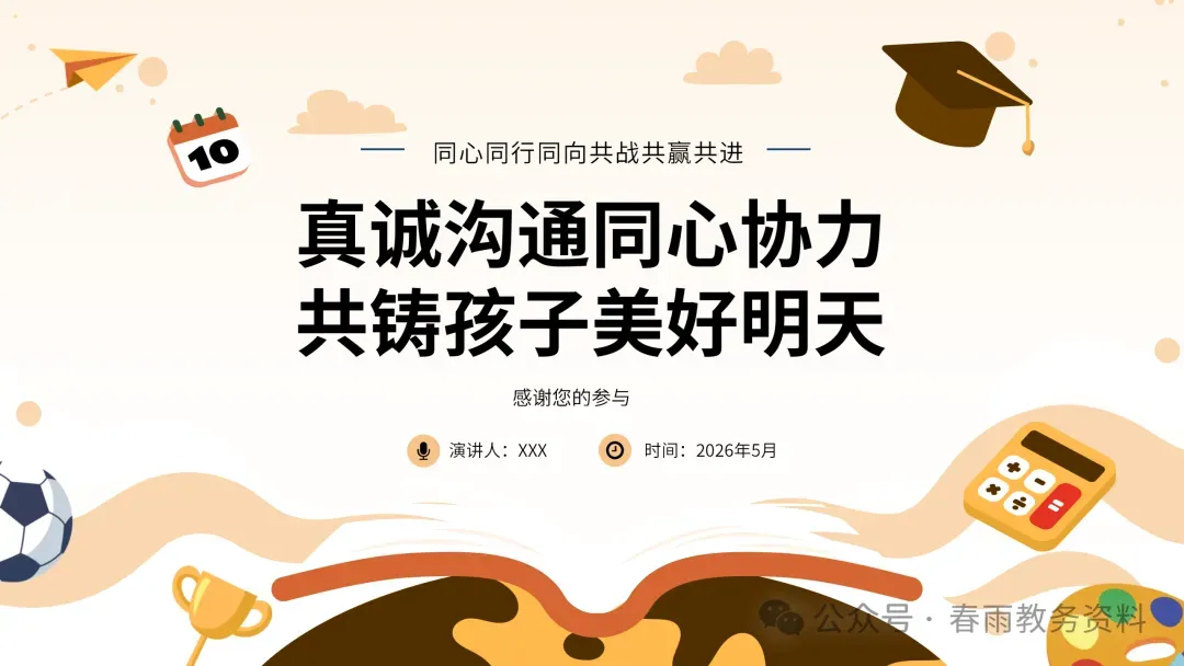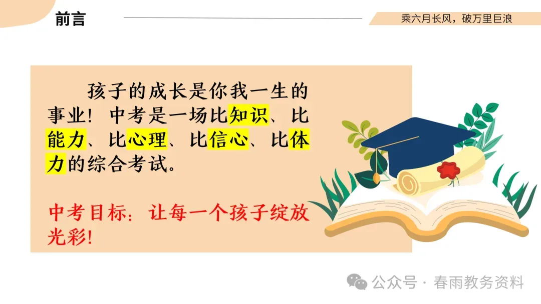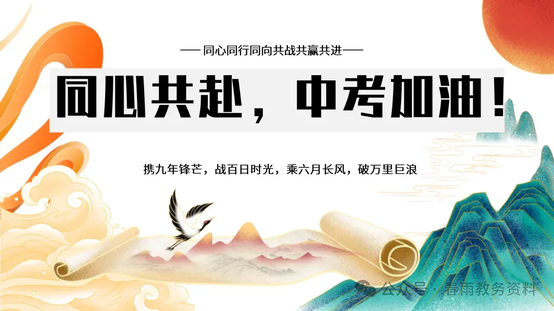 很高兴在这与您相遇,如果您是一位班主任老师,每天除了应对繁重的教学工作,还要加班整理班级、教务、教研、课件PPT资料,请关注下方的“春雨教务资料”,让我们风雨同路、一起成长~今天分享的是初三九年级考前冲刺春季下学期家长会的ppt课件及配套的发言稿,主题是《同心共赴,中考加油!》(文末有课件资料的获取方式)