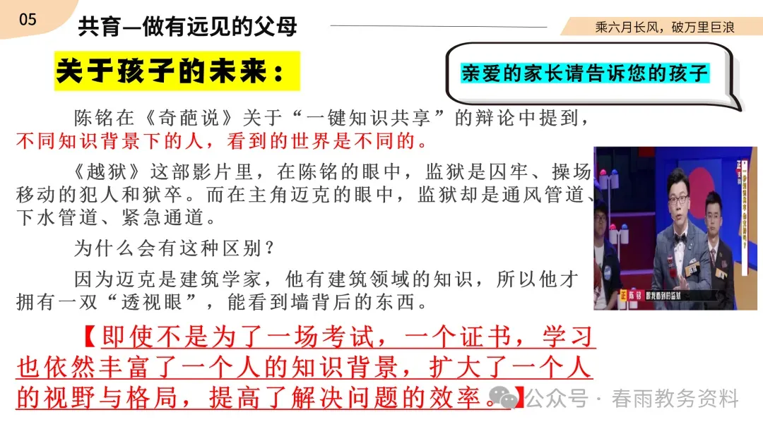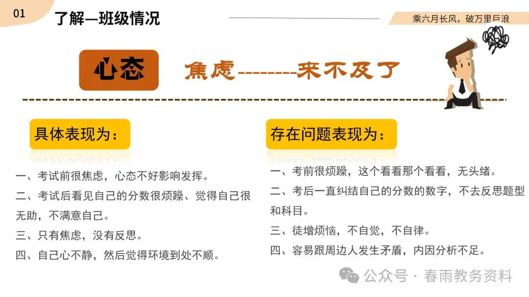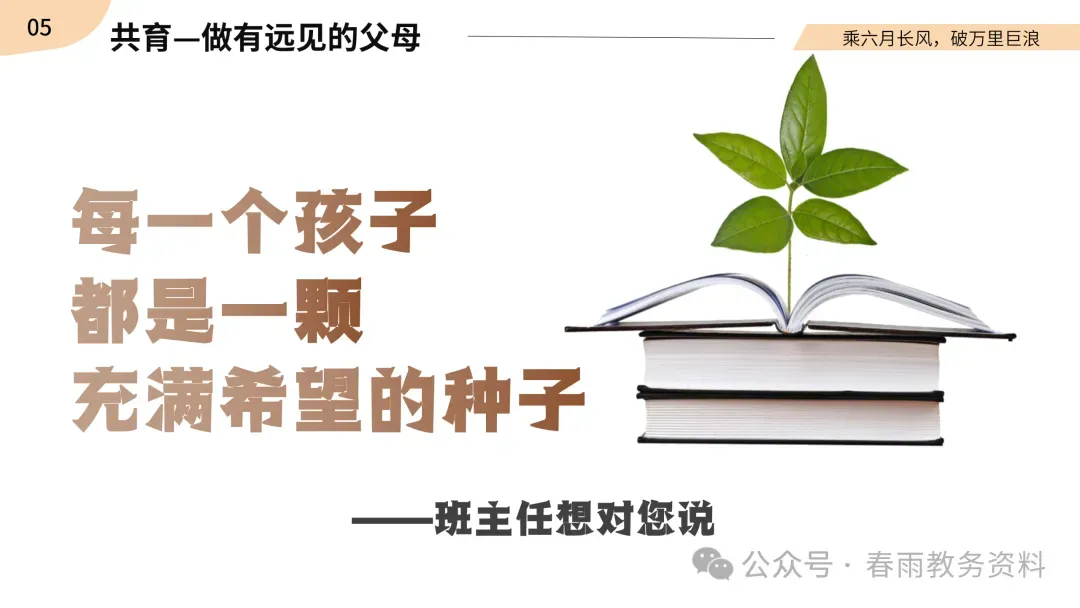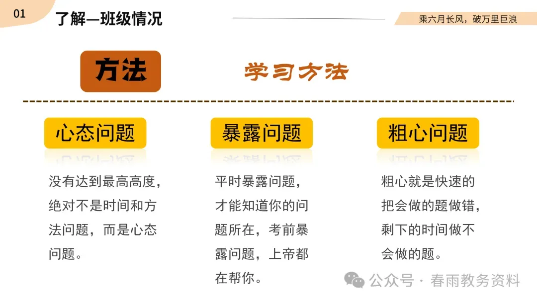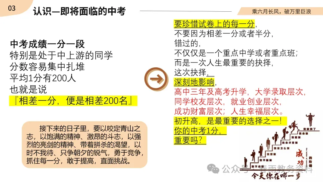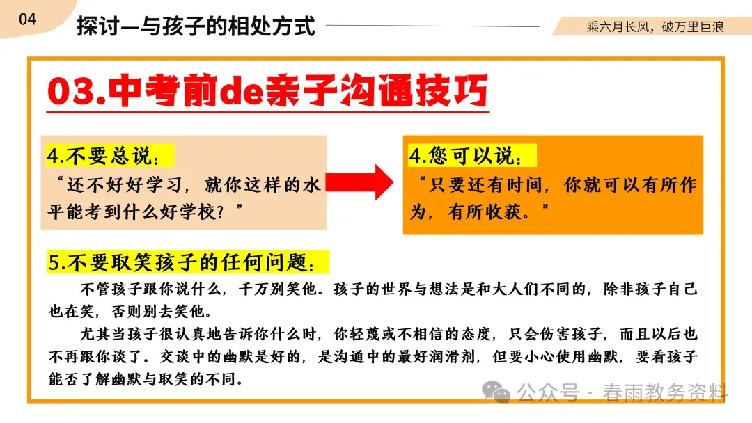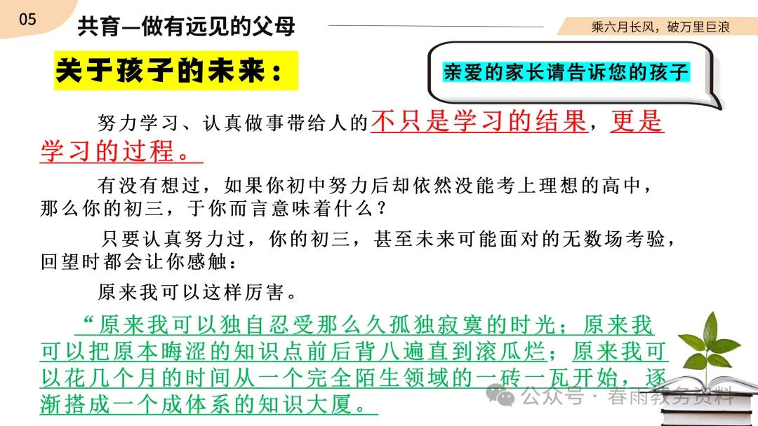 很高兴在这与您相遇,如果您是一位班主任老师,每天除了应对繁重的教学工作,还要加班整理班级、教务、教研、课件PPT资料,请关注下方的“春雨教务资料”,让我们风雨同路、一起成长~今天分享的是初三九年级考前冲刺春季下学期家长会的ppt课件及配套的发言稿,主题是《同心共赴,中考加油!》(文末有课件资料的获取方式)
