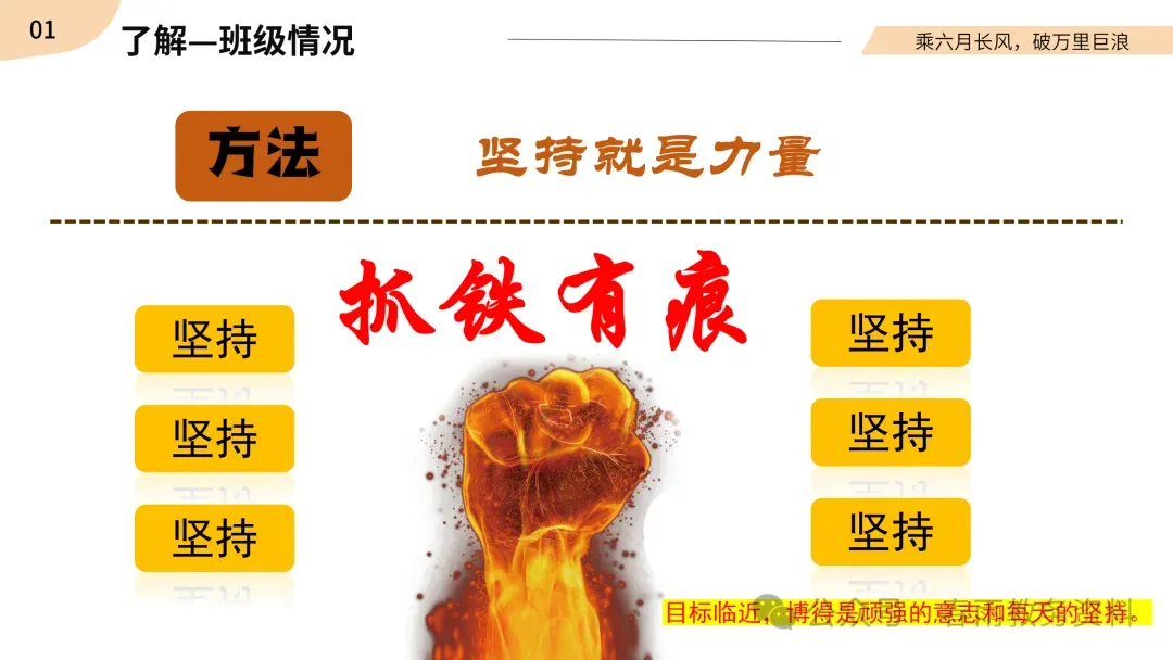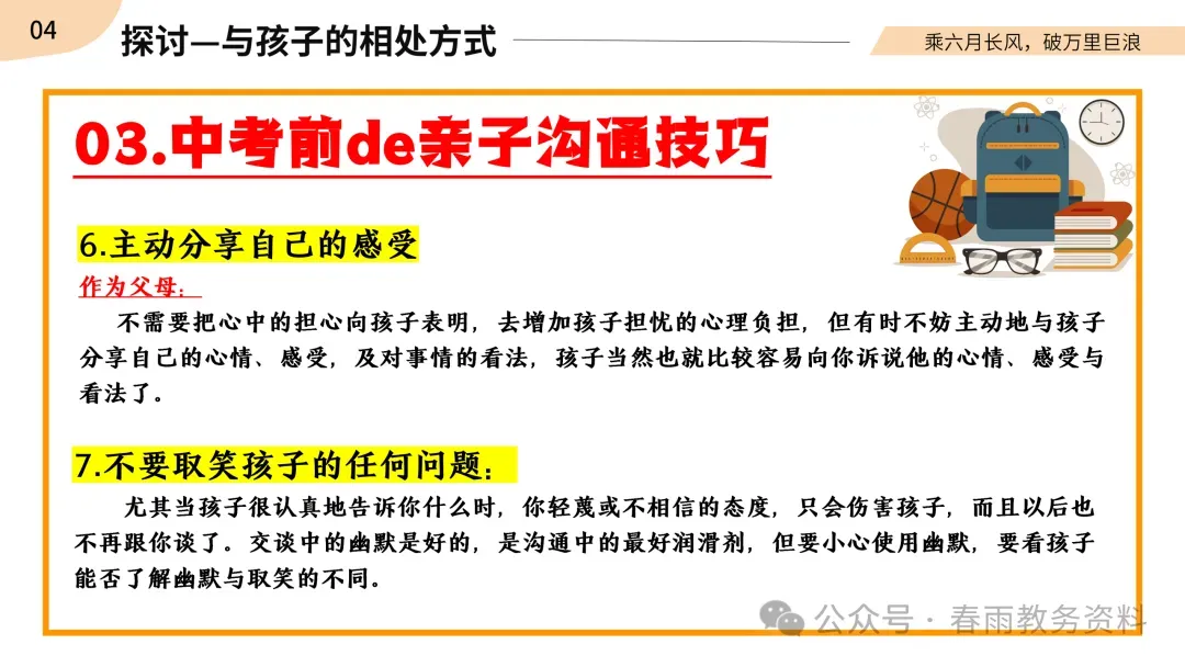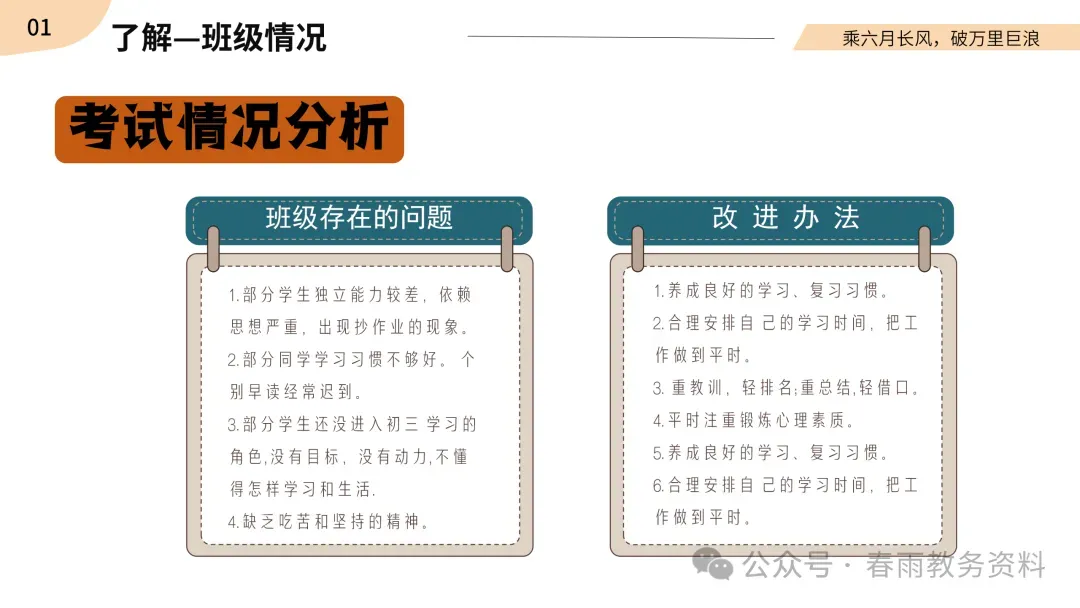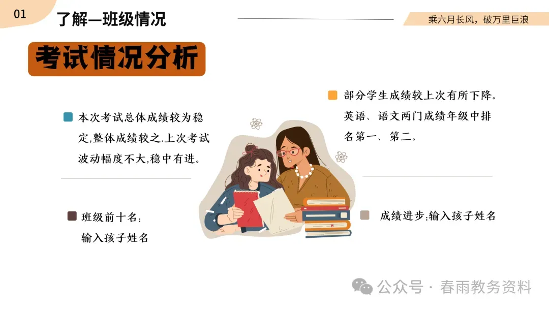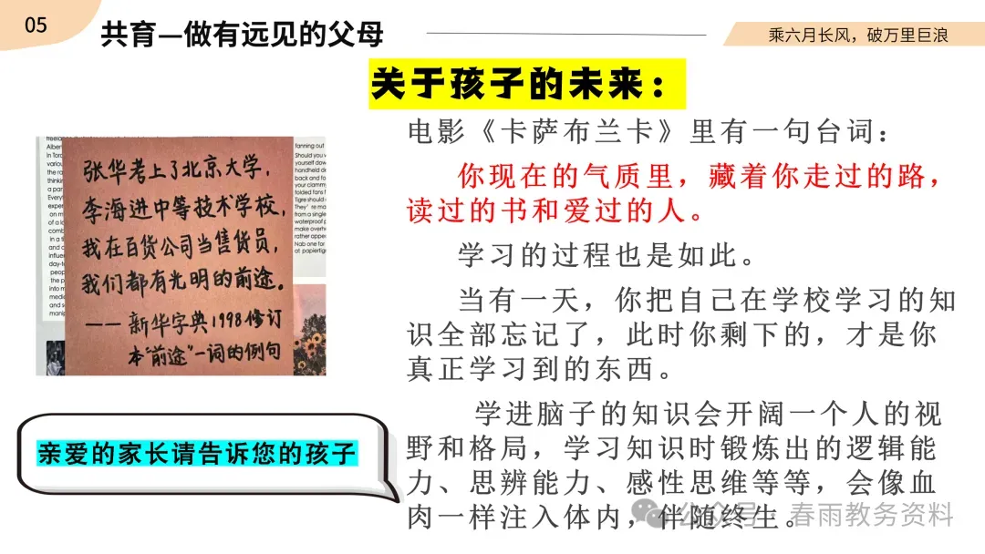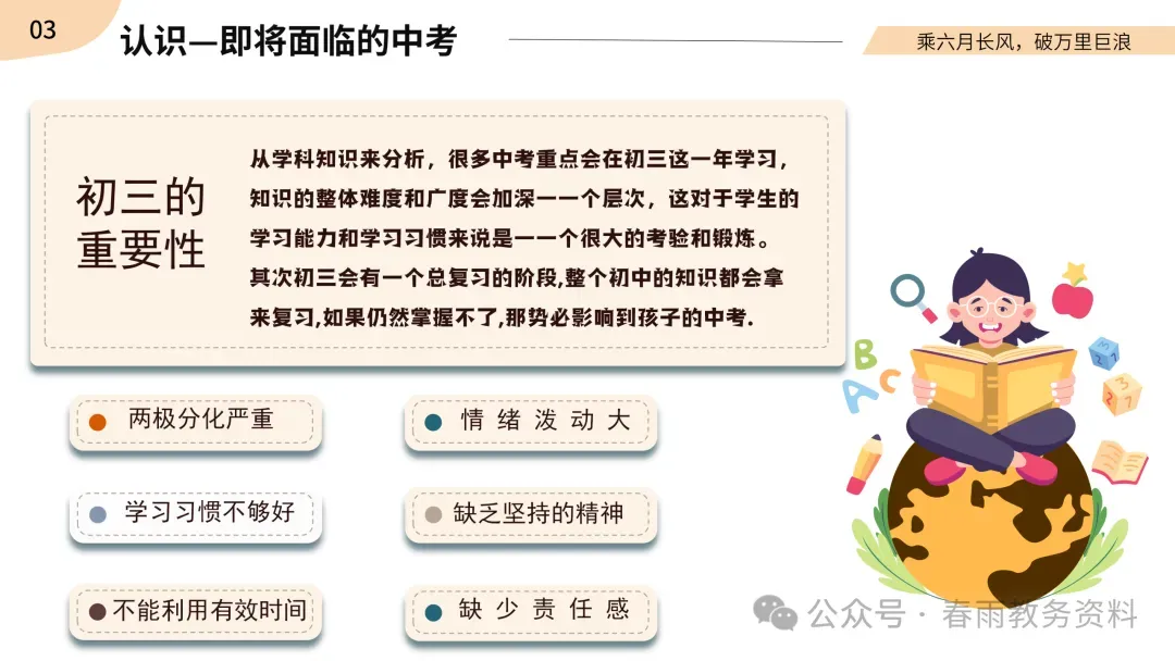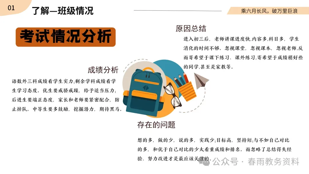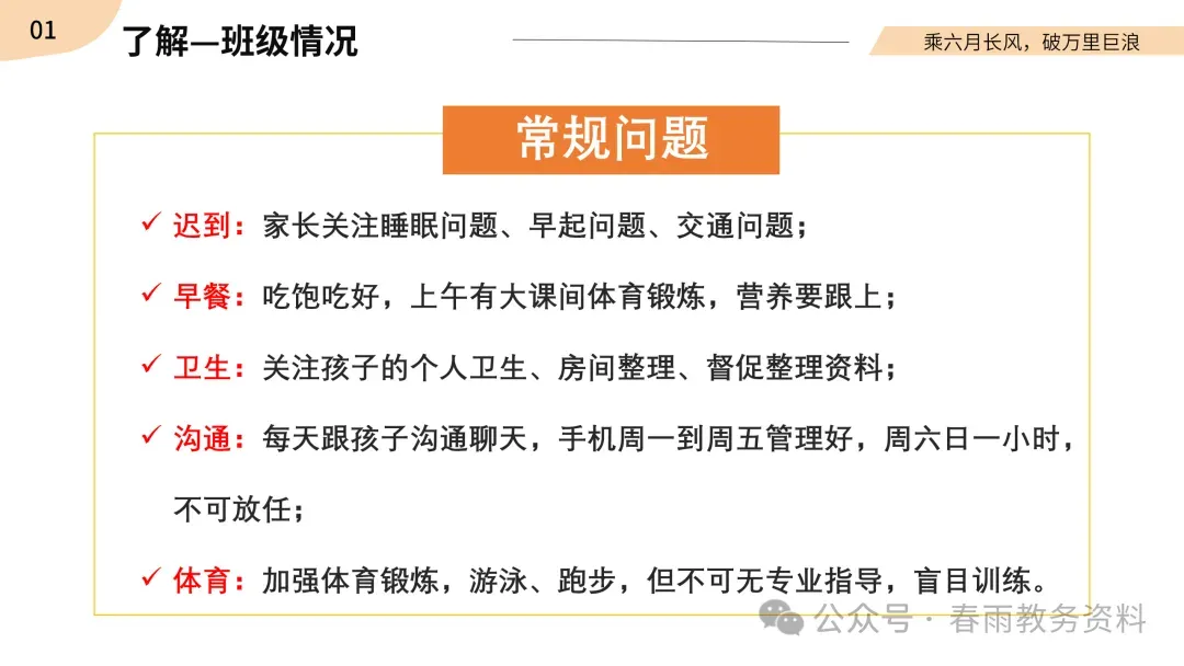 携九年锋芒,战百日时光,乘六月长风,破万里巨浪,本次家长会将分5个板块进行:了解—班级情况;理解—孩子的不易;认识—即将面临的中考;探讨—与孩子的相处方式;共育—做有远见的父母。