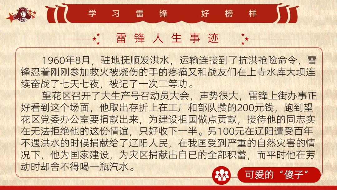 第一,可爱的"傻子",讲述雷锋同志无私奉献、乐于助人的感人事迹;