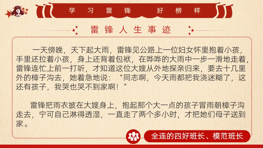 第二个故事,是关于雷锋同志作为班长如何关心战友、帮助群众的。