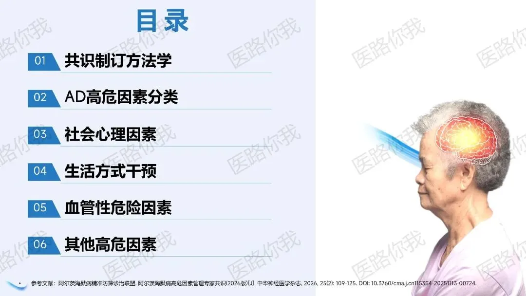 《2026阿尔茨海默病高危因素管理专家共识》告诉我们,面对阿尔茨海默病,我们并非无能为力。通过全生命周期的主动管理,控制那些“可控”的因素,我们完全有能力推迟甚至预防近半数痴呆病例的发生。未来方向:共识也指出了当前的研究空白,包括肠道菌群、空气污染等新兴因素的探索,以及需要更多以临床硬终点为目标的中国人群大型干预研究。行动呼吁:从今天开始,关注您的血压、听力、睡眠和情绪。因为预防痴呆,最好的时间是十年前,其次是现在。参考文献:阿尔茨海默病精准防筛诊治联盟. 阿尔茨海默病高危因素管理专家共识(2026版)[J]. 中华神经医学杂志, 2026, 25(2): 109-125. DOI: 10.3760/cma.j.cn115354-20251113-00724.声明:本文根据网络内容进行整理,仅作知识分享,不可用于其他商业用途,如涉及版权,请及时联系小编予以删除。本文所提供的信息不能以任何方式取代专业的医疗指导,也不应被视为诊疗建议,只为帮助更多读者了解相关疾病领域的宝贵知识。