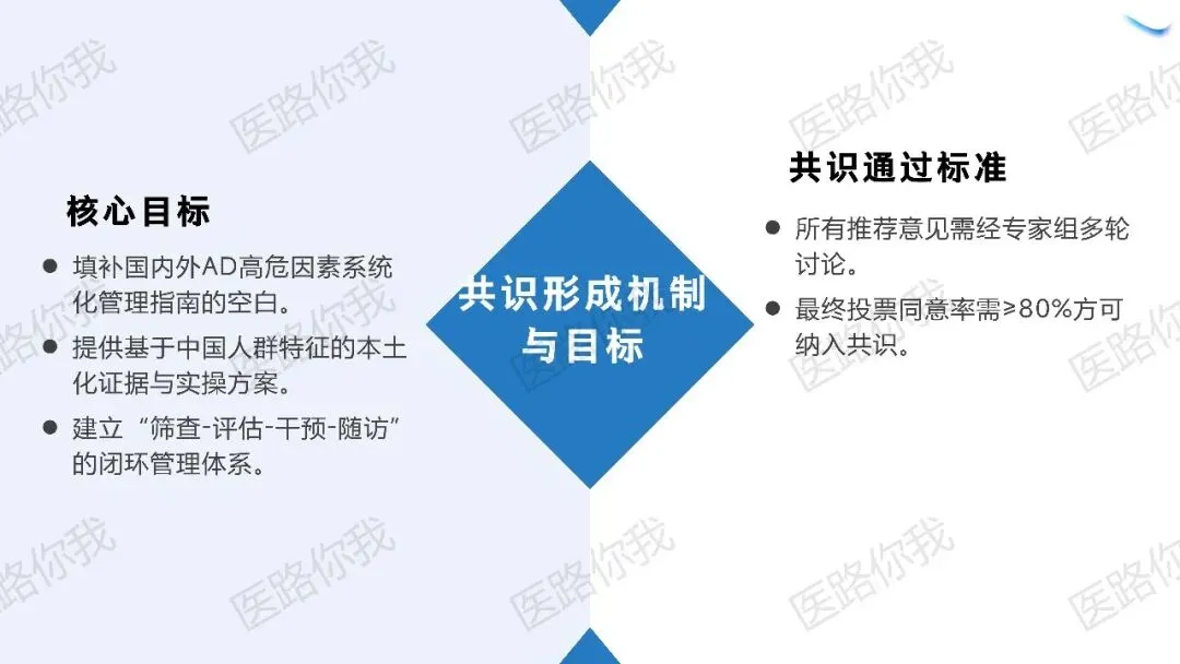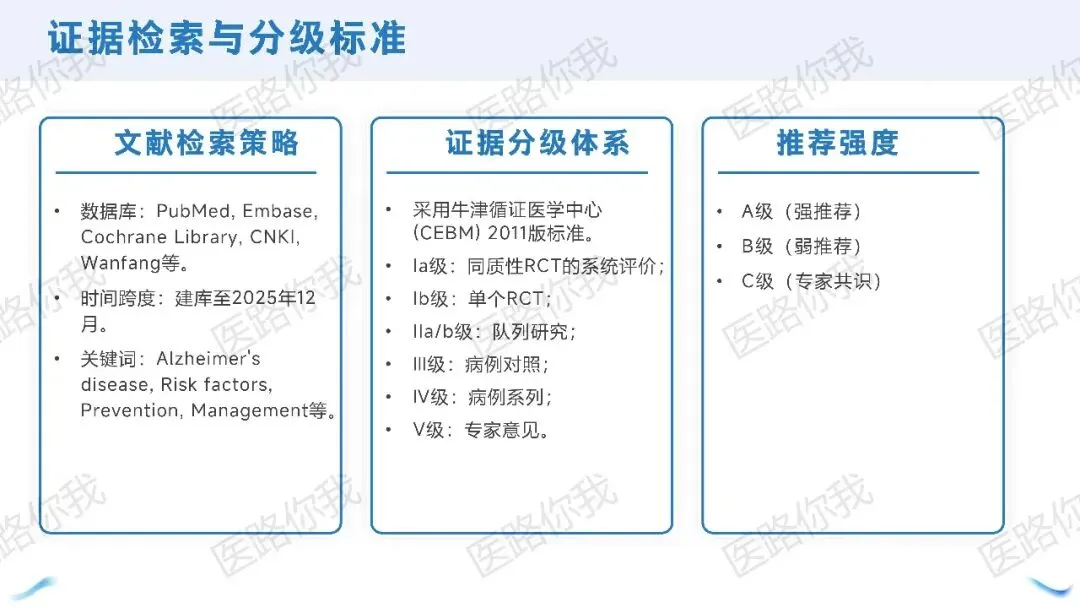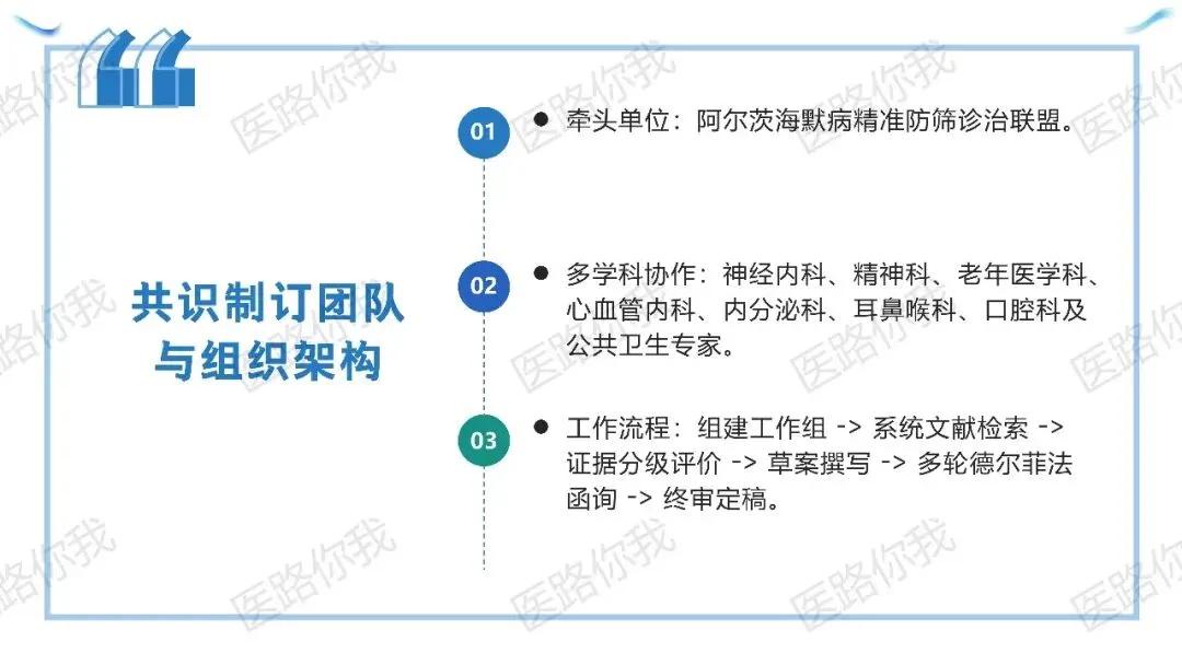 本共识由阿尔茨海默病精准防筛诊治联盟牵头,联合神经内科、心血管、内分泌等多学科专家,严格遵循国际指南制订标准: