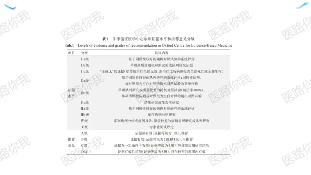 证据分级:采用牛津CEBM 2011版标准(Ia级为最高证据),对应A/B/C三级推荐强度。