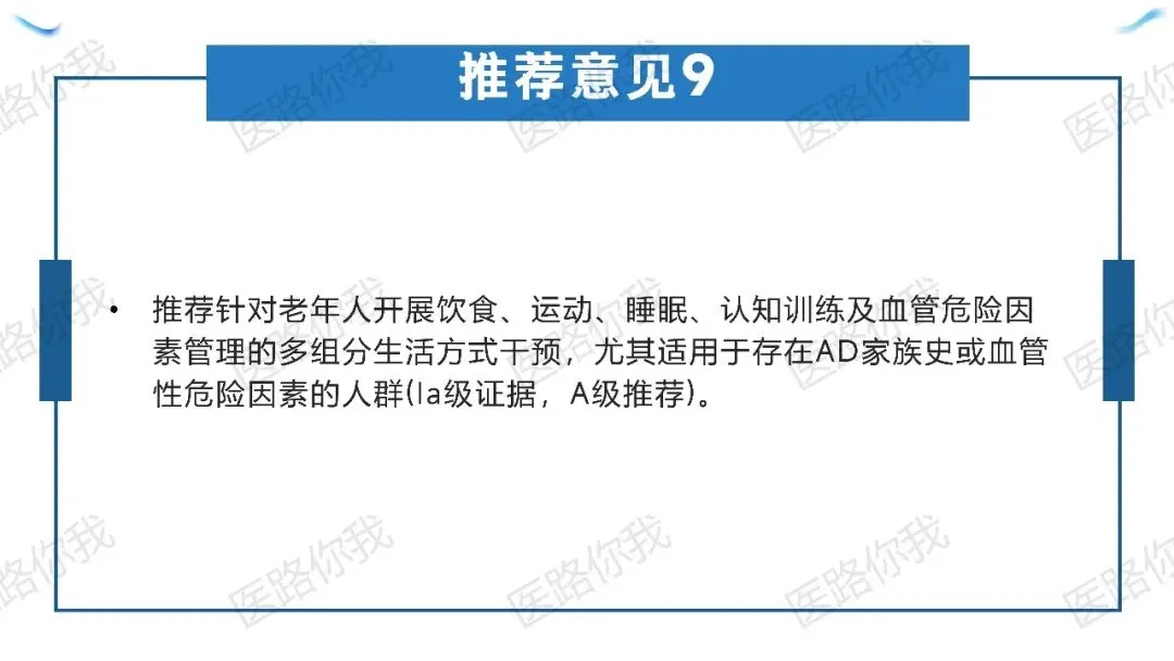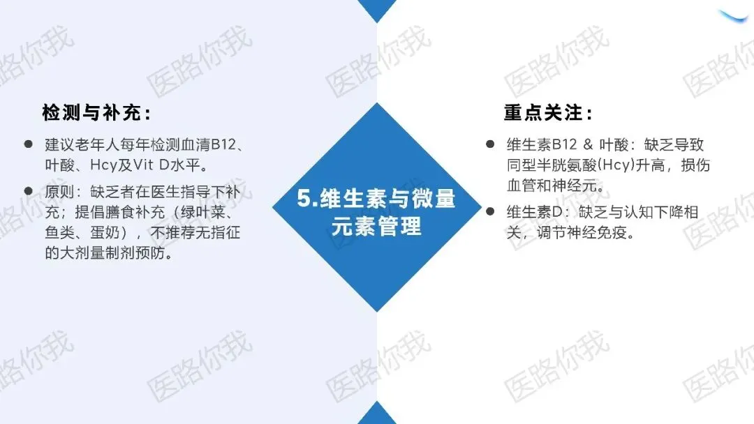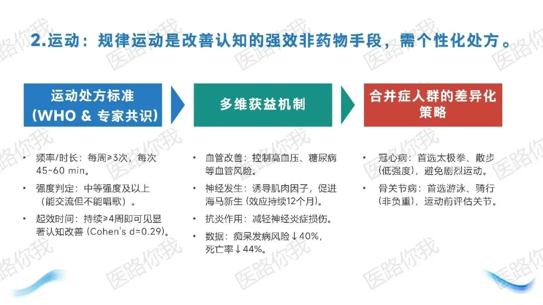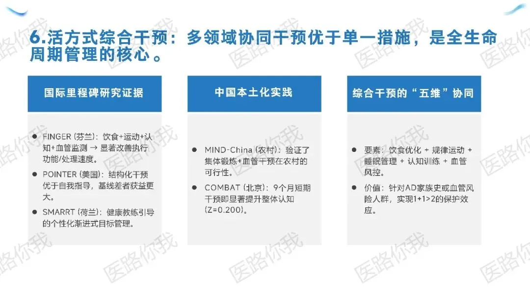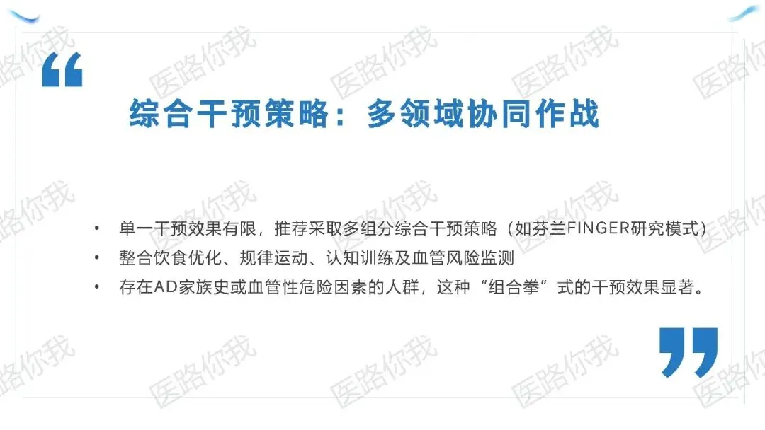 核心策略:针对有AD家族史或血管风险的人群,同步实施“五维协同”(饮食优化、规律运动、睡眠管理、认知训练、血管风控)。