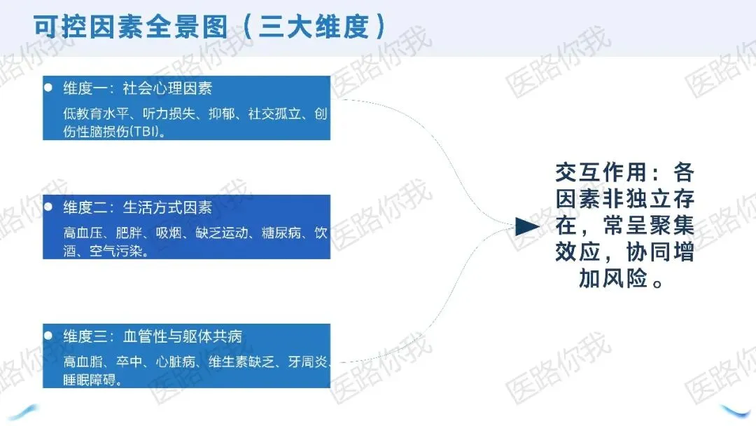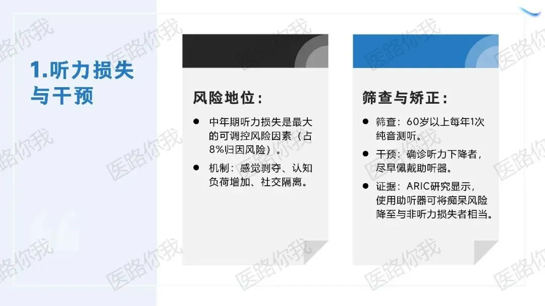 听力:中年听力损失是最大的可调控风险(归因8%)。佩戴助听器可将风险降至与非听力损失者相当。