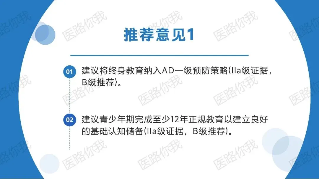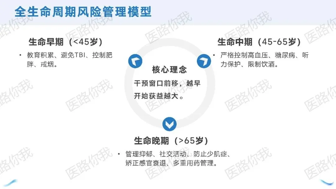 共识打破了“AD是老年病”的传统认知,构建了“生命早期积累储备 -> 生命中期控制风险 -> 生命晚期综合管理”的全周期模型:<45岁:重点在于教育积累、避免脑外伤、控制肥胖。