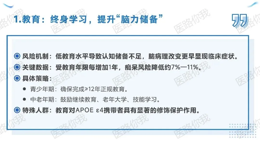 中老年期鼓励参与继续教育、老年大学,这对APOE ε4基因携带者尤为关键。