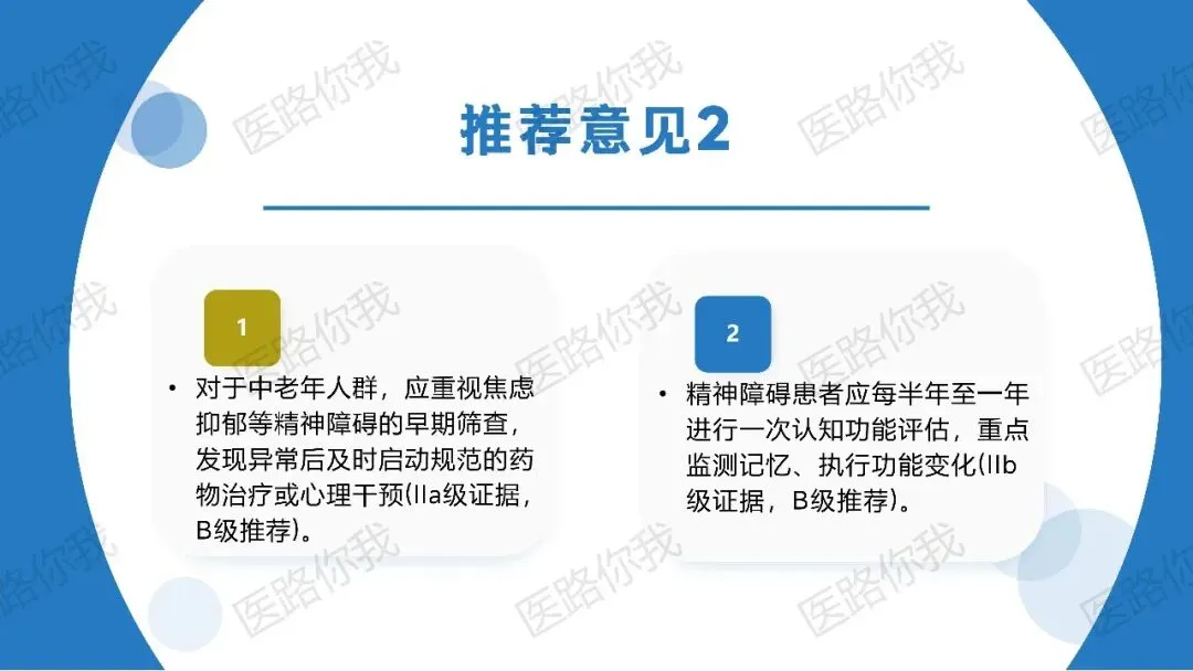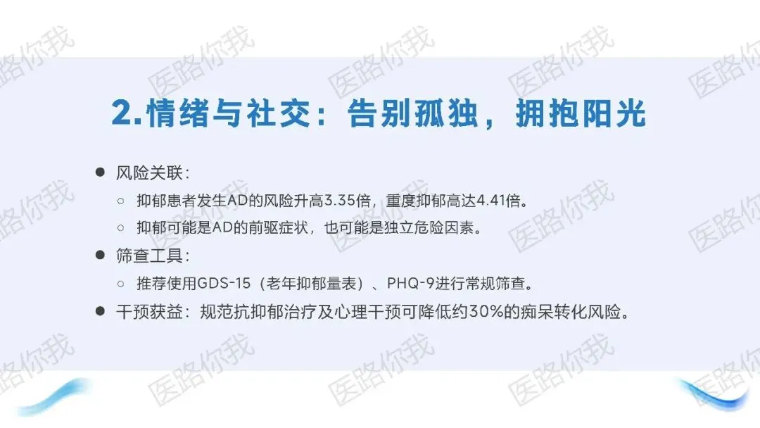 对中老年人进行常规抑郁筛查(GDS-15/PHQ-9),规范治疗可降低30%的转化风险。