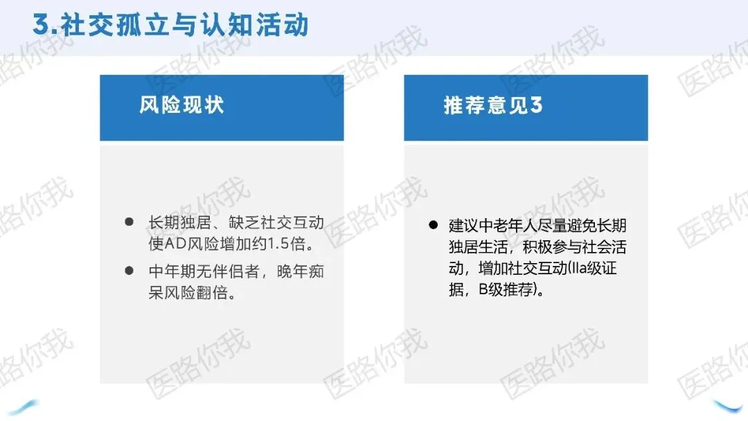 社交孤立:长期独居使风险增加约1.5倍,中年期无伴侣者晚年风险翻倍。