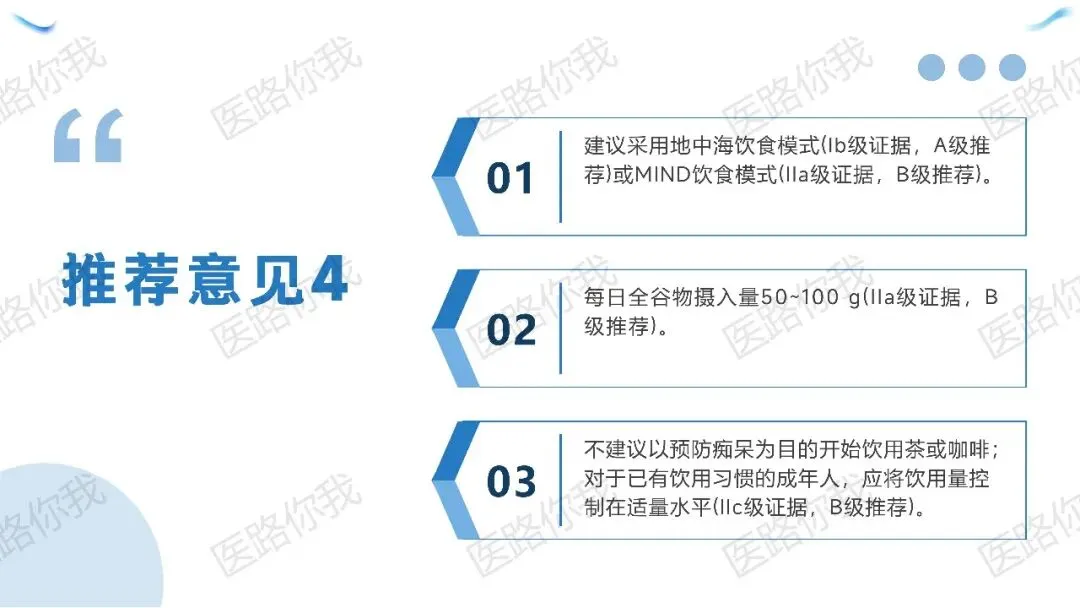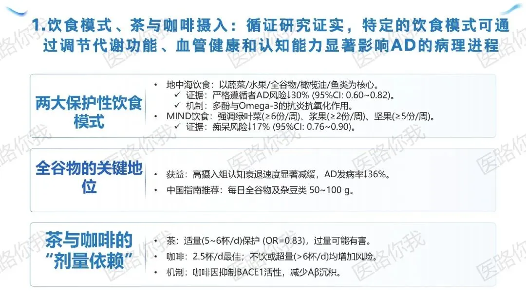 MIND饮食:特别强调绿叶菜(≥6份/周)和浆果(≥2份/周),高摄入组AD发病率↓36%。