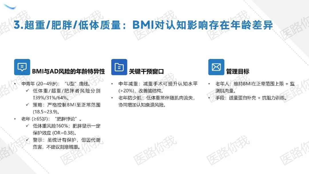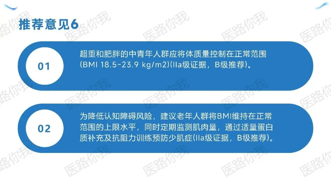策略:老年人不应刻意减重,而应维持BMI在正常范围上限,重点通过抗阻力训练和蛋白补充预防少肌症。