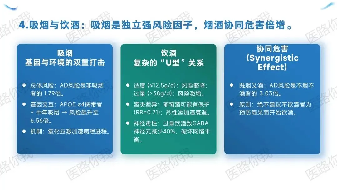 吸烟:独立强风险因子(风险↑1.79倍),若携带APOE ε4基因且中年吸烟,风险飙升至6.56倍。