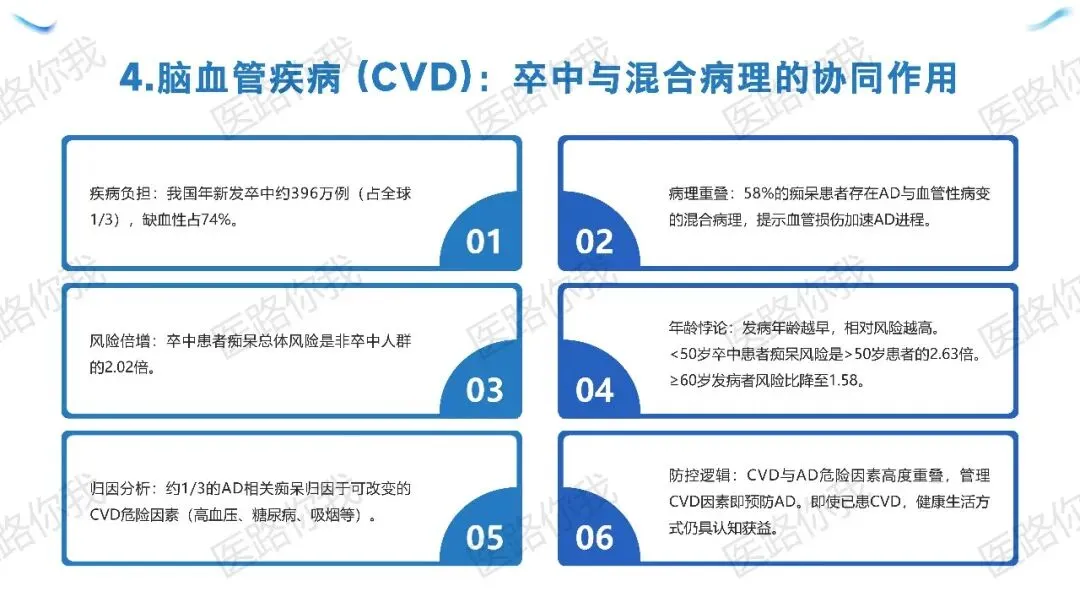 卒中:卒中患者痴呆风险是非卒中人群的2.02倍,且发病越早风险越高。