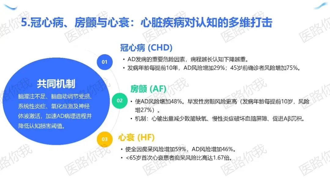 心脏疾病:心衰、房颤、冠心病均显著增加AD风险(46%-59%)。
