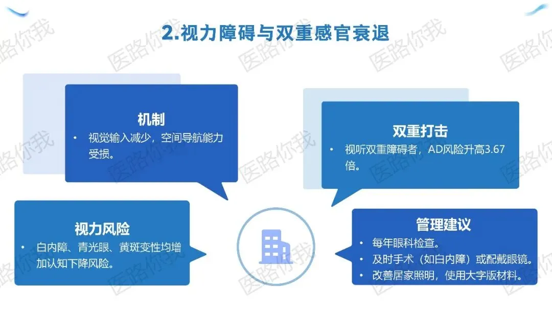 视力:视听双重障碍者风险升高3.67倍。建议每年筛查,及时手术或配镜。