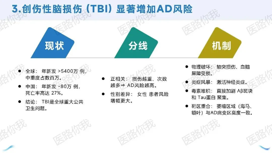 脑外伤(TBI):损伤越重、次数越多,风险越高。女性患者风险增幅更大。
