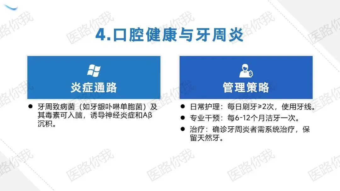 口腔:牙周炎致病菌可入脑。建议每日刷牙≥2次,定期洁牙,确诊者规范治疗。