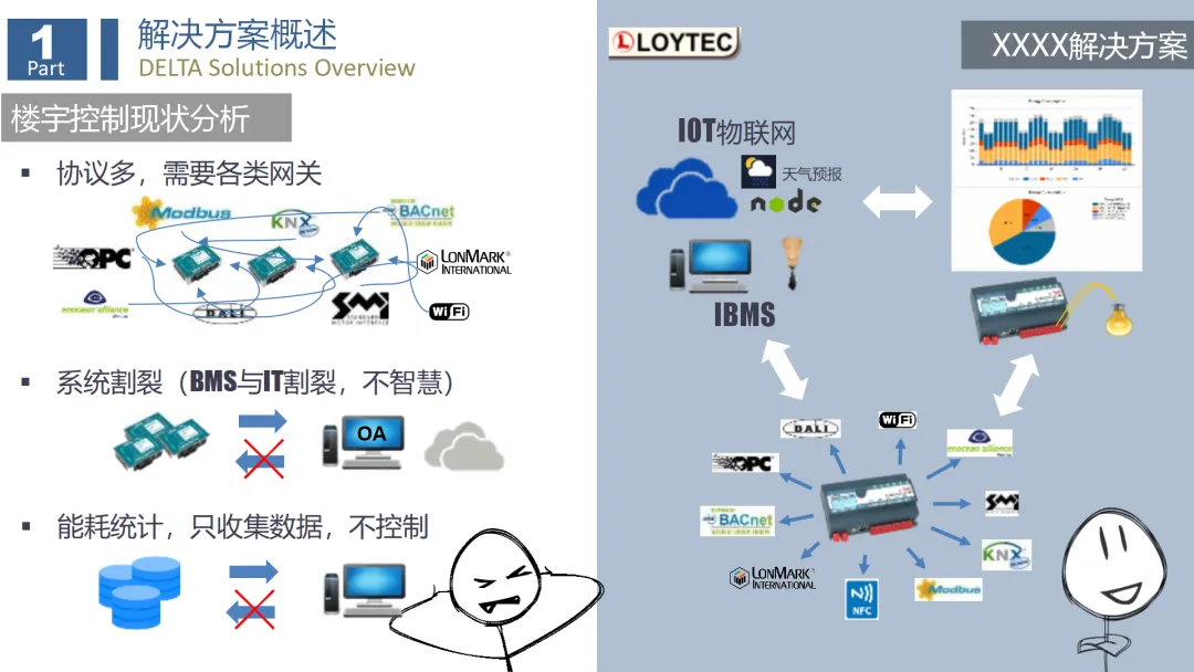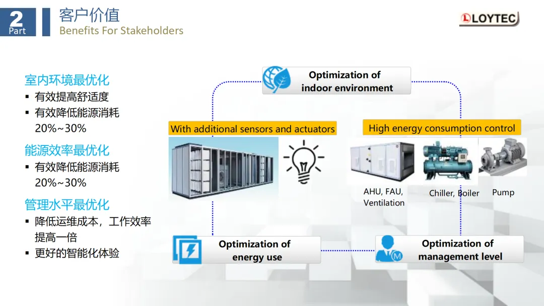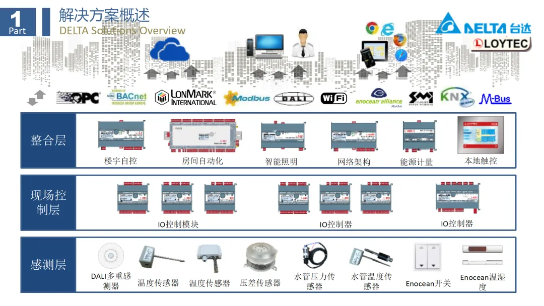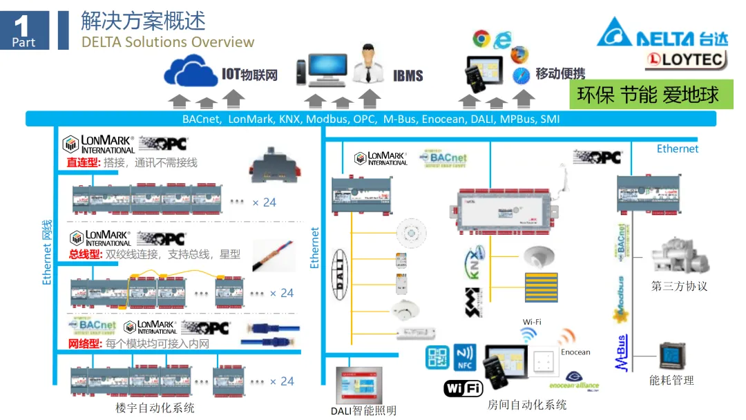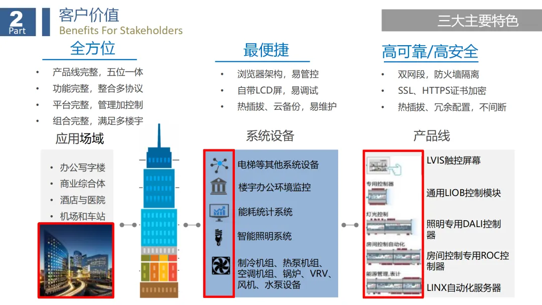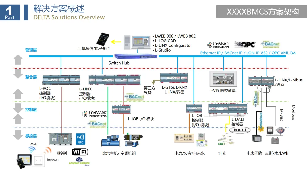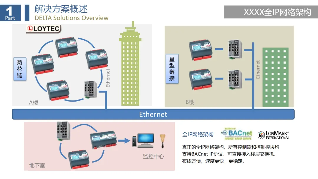 本方案涵盖楼宇自动化、安保自动化、消防自动化、办公自动化、通信自动化五大系统,通过建筑集成管理系统实现集中监测、控制与管理,让建筑具备感知、分析与响应的智能化能力。方案以“互联平台、智能建筑”为核心理念,针对协议复杂、系统割裂、能耗统计与控制脱节等行业痛点,构建了全IP网络架构的楼宇设备与能源管理系统。所有控制器和控制模块均支持BACnet IP协议,可直接接入楼层交换机,布线便捷、传输稳定,实现从感控层、控制层到管理层的一体化贯通。在技术产品层面,方案提供涵盖制冷机组、空调系统、智能照明、电梯系统、能耗统计等全系列设备与控制模块,控制器集成网关功能,支持多种通讯协议无缝转换,适用于新建与改造项目。本地触控屏与LWEB管理平台相结合,为工程商提供灵活调试工具,为最终用户提供直观操作界面。应用场景覆盖商业综合体、医院、办公楼宇等典型建筑形态。针对商业综合体,实现跨协议集成与统一平台管理;面向医院,满足7×24小时不间断运营、区域分区控制与正压无菌环境等特殊要求;针对办公楼宇,聚焦舒适度控制、智能照明与新风调节,在提升用户体验的同时实现20%-30%的节能效果。方案通过以人为本、按需使用的设计原则,达成室内环境最优化、能源效率最优化与管理水平最优化的三重目标。